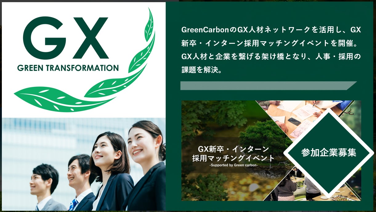 Green CarbonのGX人材ネットワークを活用し、GX新卒・インターン採用マッチングイベントを2025年春頃に開催します。GX人材と企業を繋げる架け橋となり、人事・採用の課題を解決することを目指します。詳細は追ってご案内します。