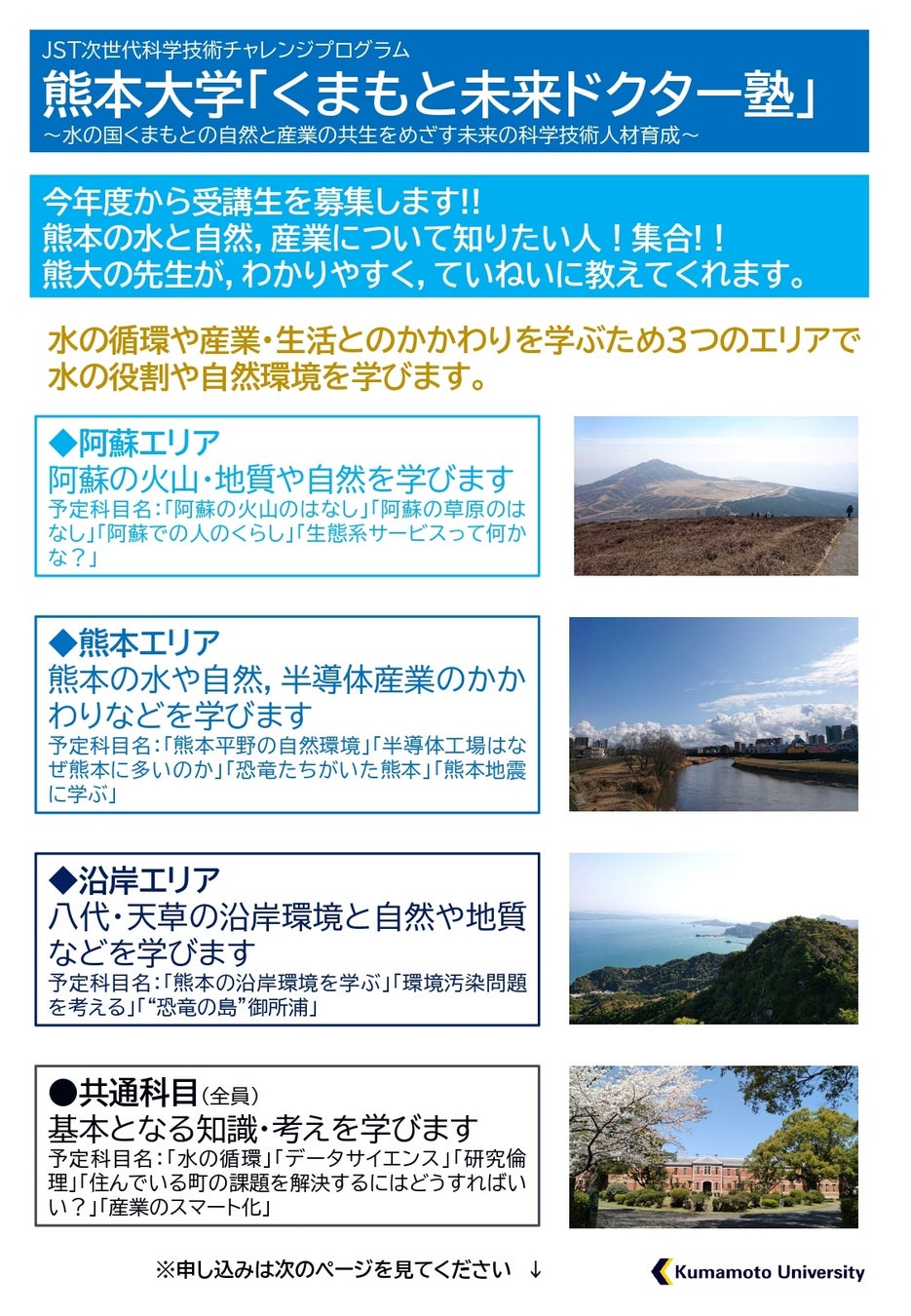 その取り組みである「くまもと未来ドクター塾 ~水の国くまもとの自然と産業の共生をめざす未来の科学技術人材育成~」の開講にあたり受講生を募集しています。ご応募お待ちしております。