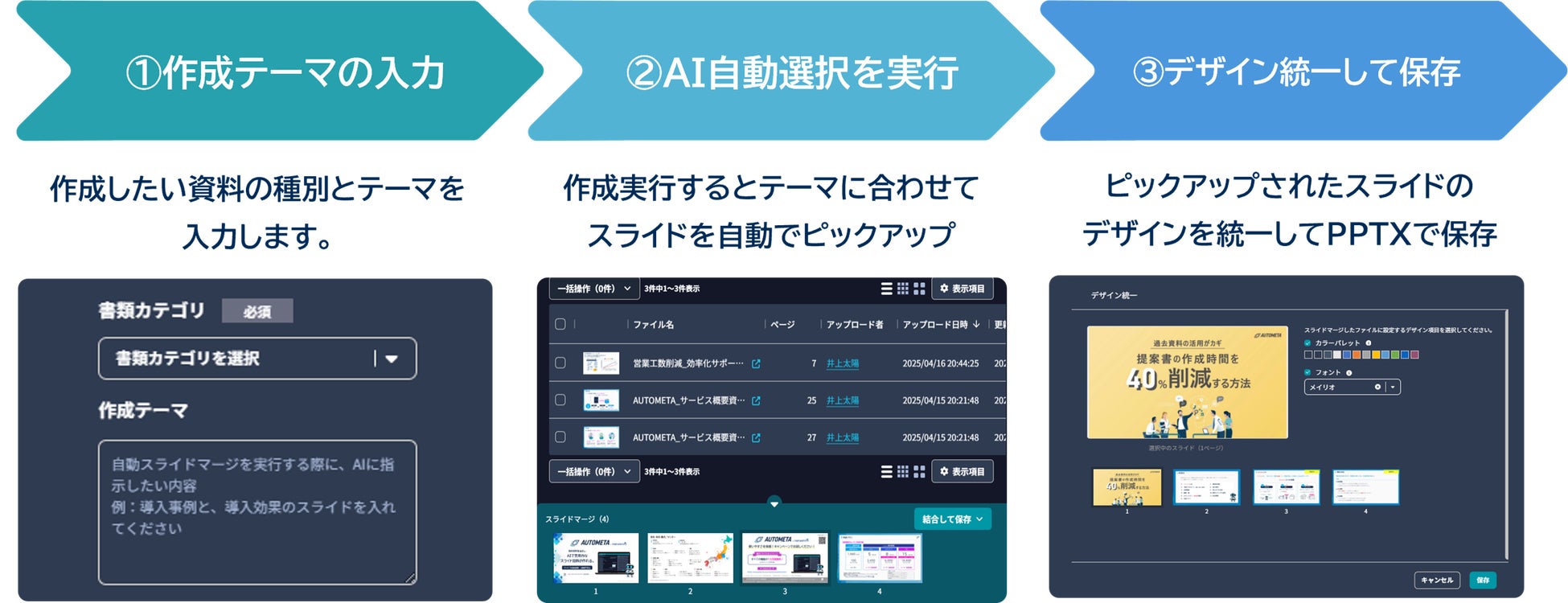 これらの課題をうけ、AUTOMETAでは、資料を“1から作る”のではなく使える資料を“組み合わせて活用する”という実務的アプローチに着目し、蓄積された既存資料をもとに、AIが構成設計から資料作成までを担う「AIスライドマージ」の開発に至りました。