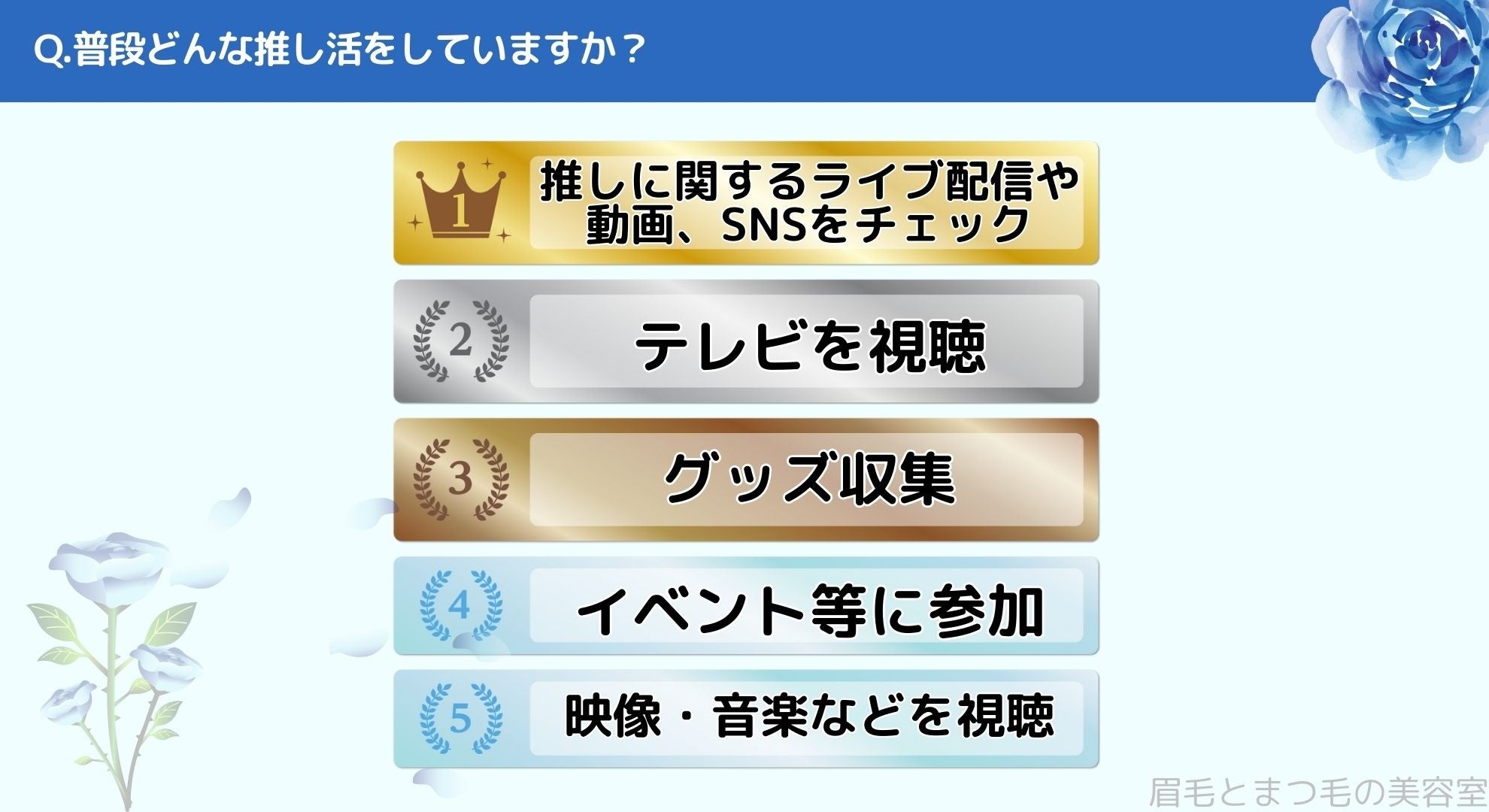 普段どんな推し活をしているかお聞きしたところ「1位>推しに関するライブ配信や動画、SNSをチェック」、「2位>テレビを視聴」、「3位>グッズ収集」、「4位>イベント等に参加」、「5位>映像・音楽などを視聴」という結果になりました。