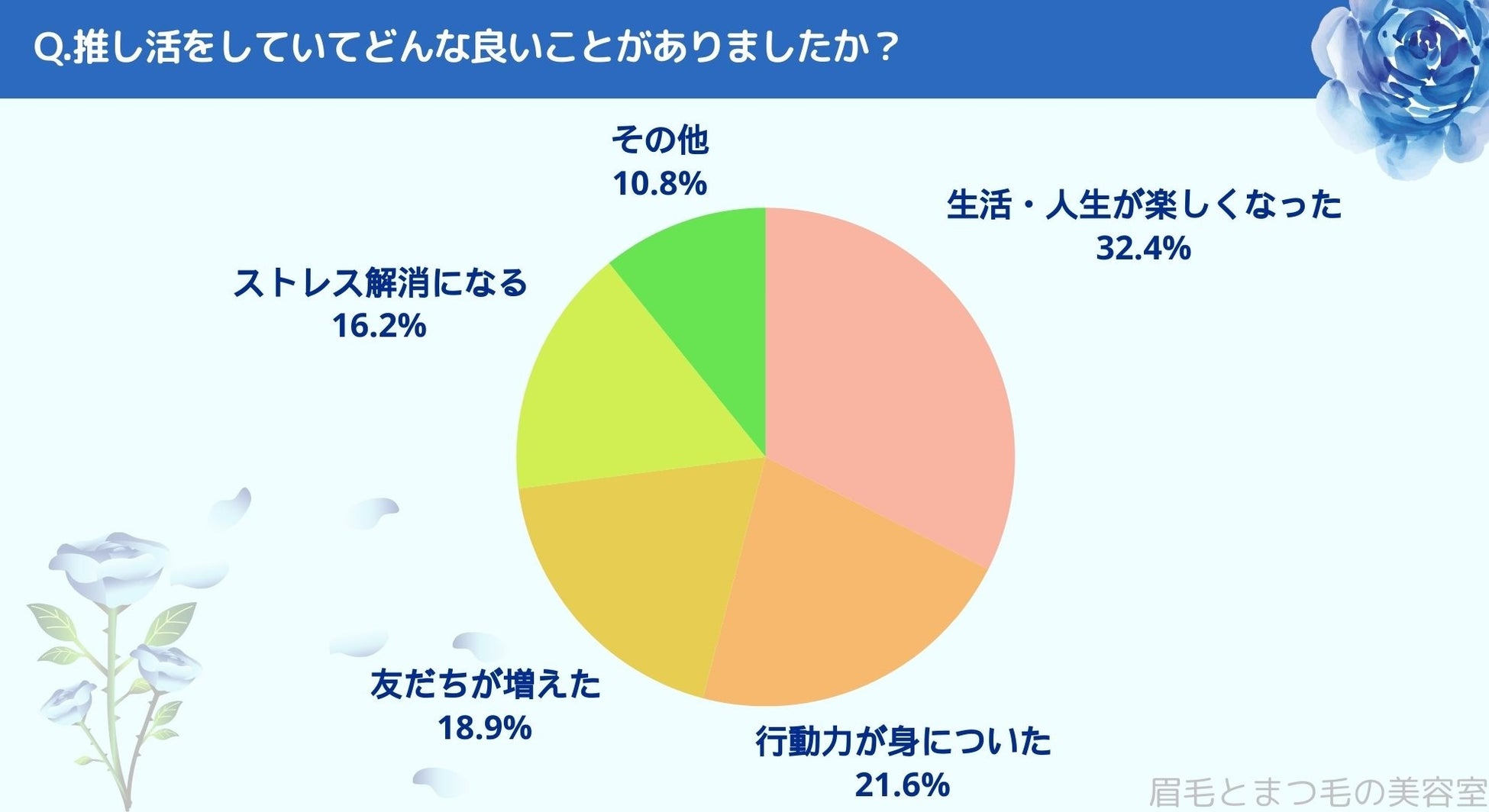 推し活をしていてどんな良いことがあったかお聞きしたところ「生活・人生が楽しくなった(32.4%)」、「行動力が身について(21.6%)」、「友だちが増えた(18.9%)」、「ストレス解消になる(16.2%)」、「その他(10.8%)」という結果になりました。