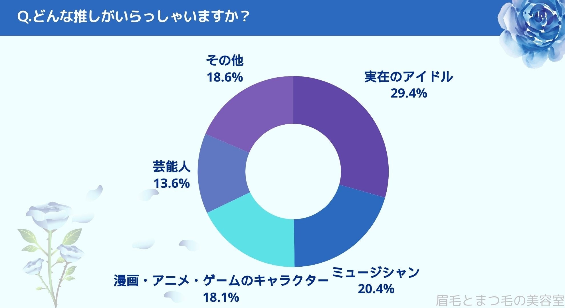 どんな推しなのかお聞きしたところ「実在のアイドル(29.4%)」、「ミュージシャン(20.4%)」、「漫画・アニメ・ゲームのキャラクター(18.1%)」、「芸能人(13.6%)」、「その他(18.6%)」という結果になりました。