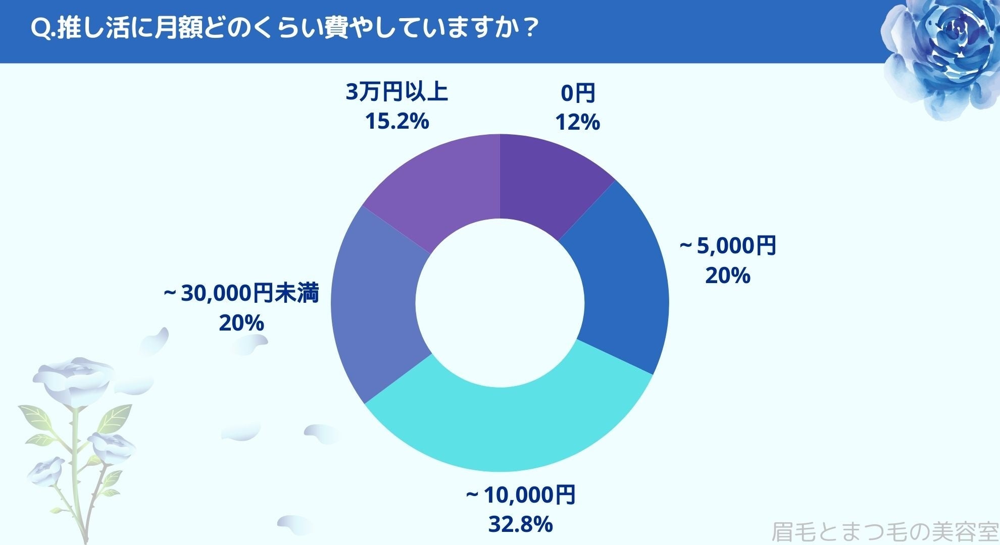 推し活に月額どのくらいお金をかけているかお聞きしたところ「0円(12%)」、「~5,000円(20%)」、「~10,000円(32.8%)」、「~30,000円未満(20%)」、「3万円以上(15.2%)」という結果になりました。