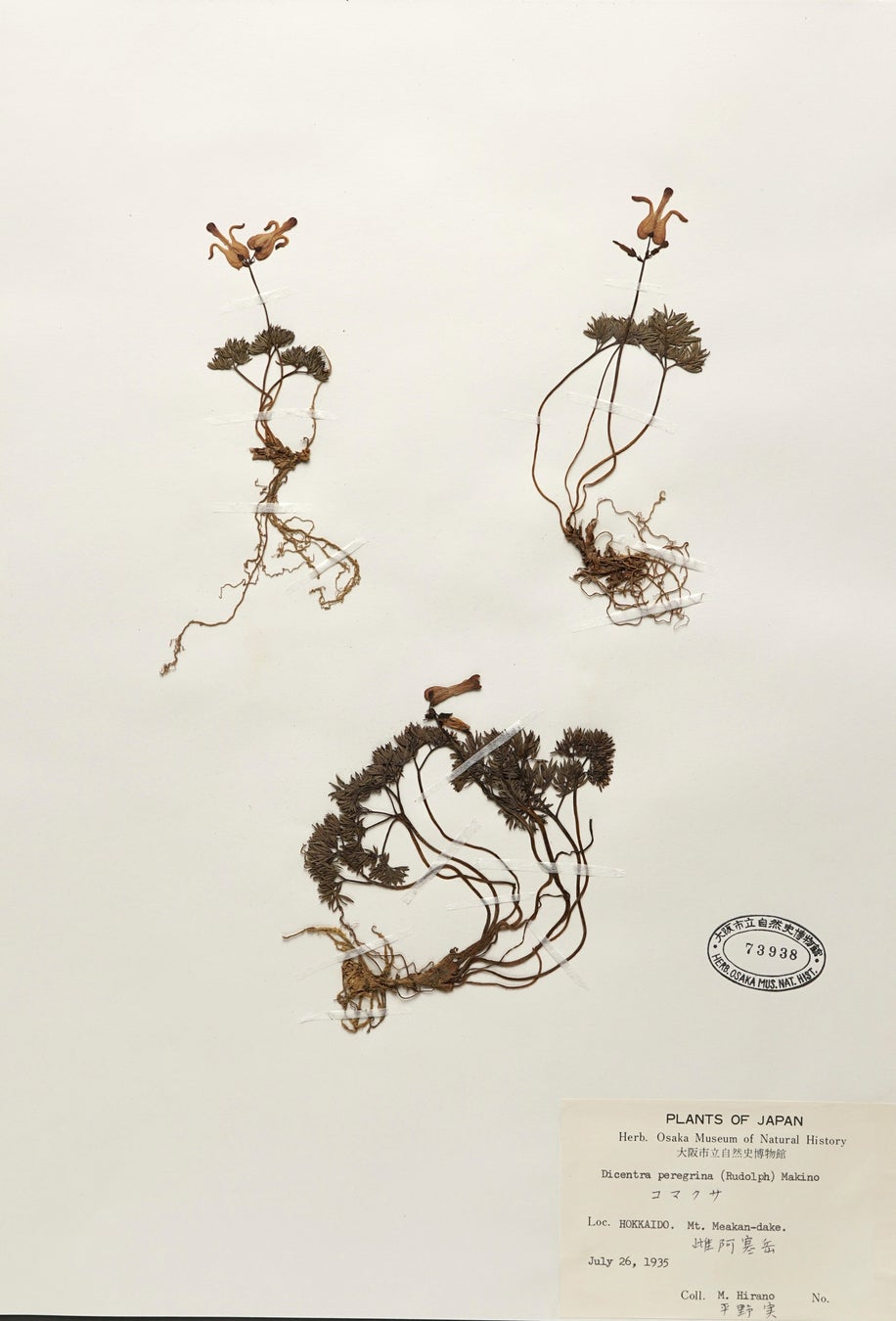 コマクサはケシ科の多年草で、日本を代表する高山植物です。漢字では「駒草」と書き、細長い花が馬の顔に似ていることから名づけられました。ほかの植物が育ちにくい高山の砂礫地に生えますが、砂礫が動きにくい深い所に根茎を張ることでこのような過酷な環境でも生育できます。展示した標本を見ると、根茎から長く伸びる葉柄や花柄が確認でき、コマクサに特徴的な生育特性が読み取れます。