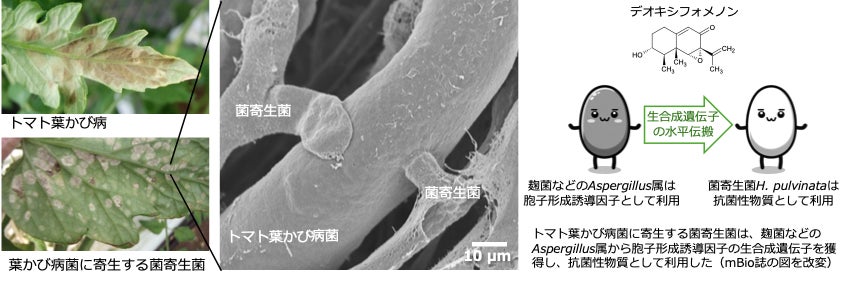 本研究グループでは、葉かび病菌に寄生することで発病を抑制する菌寄生菌Hansfordia pulvinataを発見し、その抗菌作用の鍵となる化合物「デオキシフォメノン」の生合成に関わる遺伝子群(DPHクラスター)を同定しました。更に他の菌類におけるDPHクラスターの分布についても把握したいと139種の菌類のゲノム情報において共通な遺伝子領域を解析した結果、発酵食品などに使用されるAspergillus oryzae(麹菌)とその近縁種にも保存されていることが分かりました。このことから、Aspergillus属菌との共通祖先から7680万年前に水平伝播※1によって、菌寄生菌がDPHクラスターを獲得したことが推定されました。加えて、本化合物は元々、Aspergillus属菌で胞子形成を誘導する役割を担っていましたが、菌寄生菌はDPHクラスターを獲得後に大量にデオキシフォメノンを産生し、寄生する葉かび病菌に対する抗菌性物質として役割を変化させて利用するという適応進化※2を遂げていたことも明らかにしました。これは異なる菌類において、同じ化合物をそれぞれの性質に応じた異なる目的で利用するように進化したという興味深い現象です。