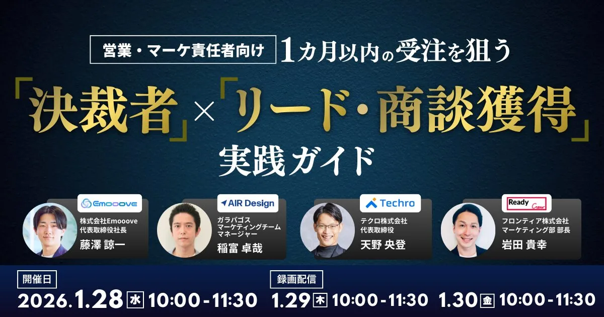 新時代の営業手法を提案する株式会社Emooove(本社:東京都渋谷区、代表取締役社長:藤澤諒一)は、営業・マーケティング責任者を対象としたウェビナー『1カ月以内の受注を狙う 「決裁者」×「リード・商談獲得」の実践ガイド』を、2026年1月28日(水)に開催いたします。