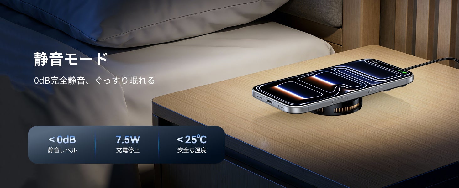 静音モードは、ボタンを 3 秒間長押しすることで冷却ファンを停止し、7.5W のワイヤレス充電に切り替わります。就寝中や静かな環境での使用に適しています。