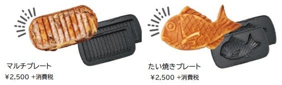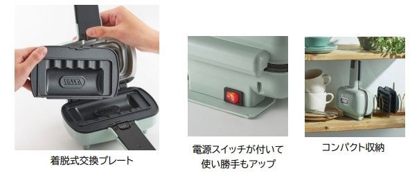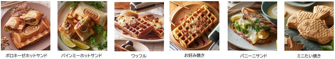 今回発売する新モデルは、着脱式交換プレートを採用し、プレートの付け替えが可能となりました。本体には「ハーフホットサンドプレート」と「ワッフルプレート」が付属し、付け替えて2種類の調理が楽しめます。プレートは取り外して水洗いができ、サッと洗えて汚れも気になりません。さらに別売の「マルチプレート」と「たい焼きプレート」を使えば、1台で料理の幅が広がります。