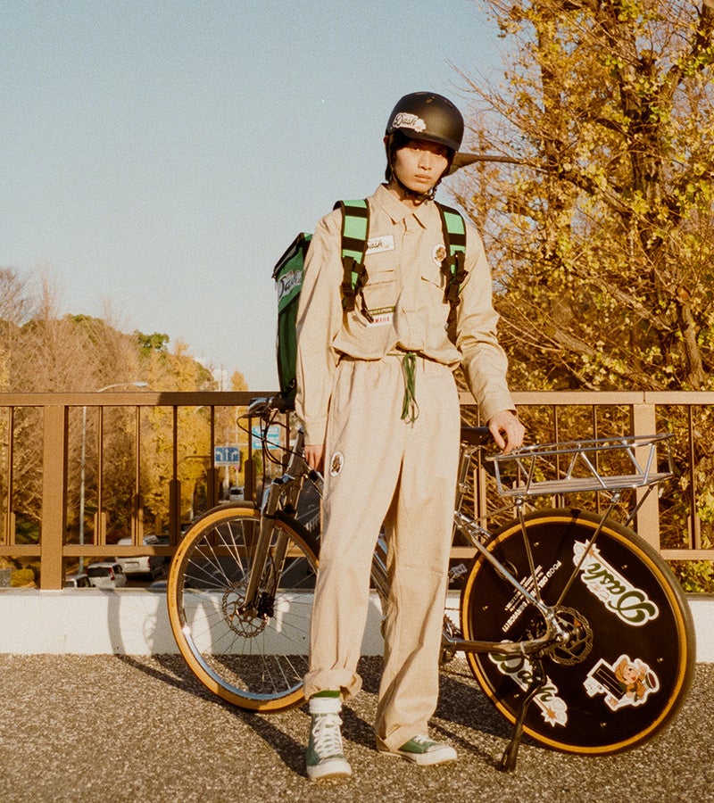 街中では日常的に当たり前の光景となっているフードデリバリースタッフ。今回FREAK’S STOREから展開される関連アパレルは、架空のフードデリバリー会社を設定し、そのスタッフが着用する架空のスタッフユニフォームなどを想定しています。架空のフードデリバリー会社の名前は「PINPON DASH(ピンポンダッシュ)」。また、これに関連したe-BIKEコンセプトモデルについても、そのスタッフがデリバリー時に使うe-BIKEをイメージしました。