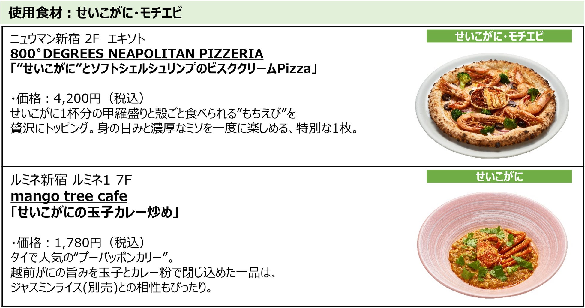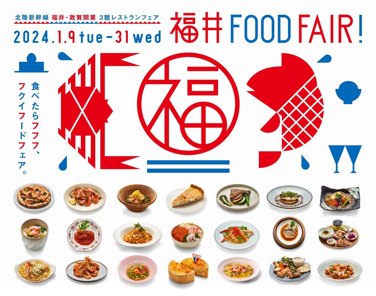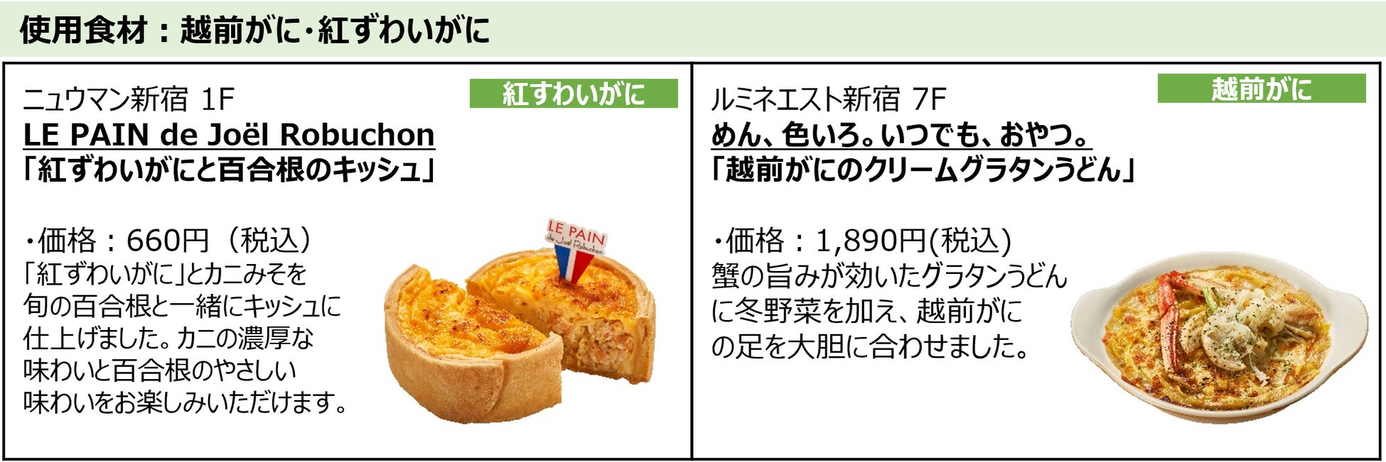 今回の企画は、2024年3月16日(土)の北陸新幹線 福井・敦賀開業で注目を集める福井県とのコラボレーション企画です。福井県には多くのブランド食材があります。今回は、越前がに・せいこがに・ふくいサーモン・敦賀真鯛・ふくい甘えびといったブランド水産物を中心に全7種の福井県産の食材を使用して、ルミネ新宿3館の18ショップが期間限定のメニューを21種類開発しています。日本海の豊かな漁場を有する福井県だからこそ美味しい福井の水産物を使った「福」をよぶ特別なメニューです。