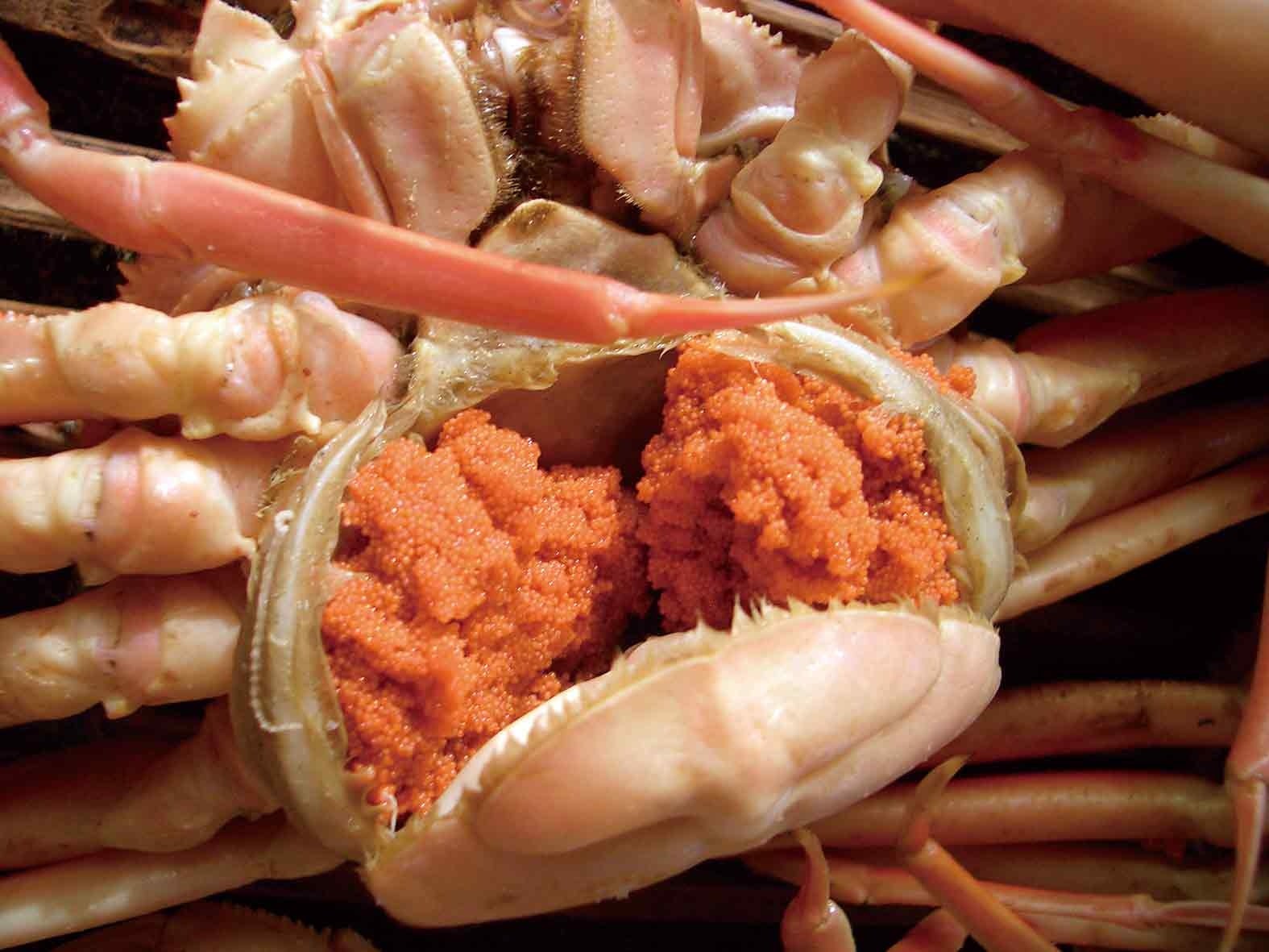 「せいこがに」とは、越前がにのメスのことです。特徴はお腹の中の外子と呼ばれる受精卵。プチプチとした触感が美味です。また、内子と呼ばれる濃い橙色の卵巣は、「赤いダイヤ」とも呼ばれる珍味です。