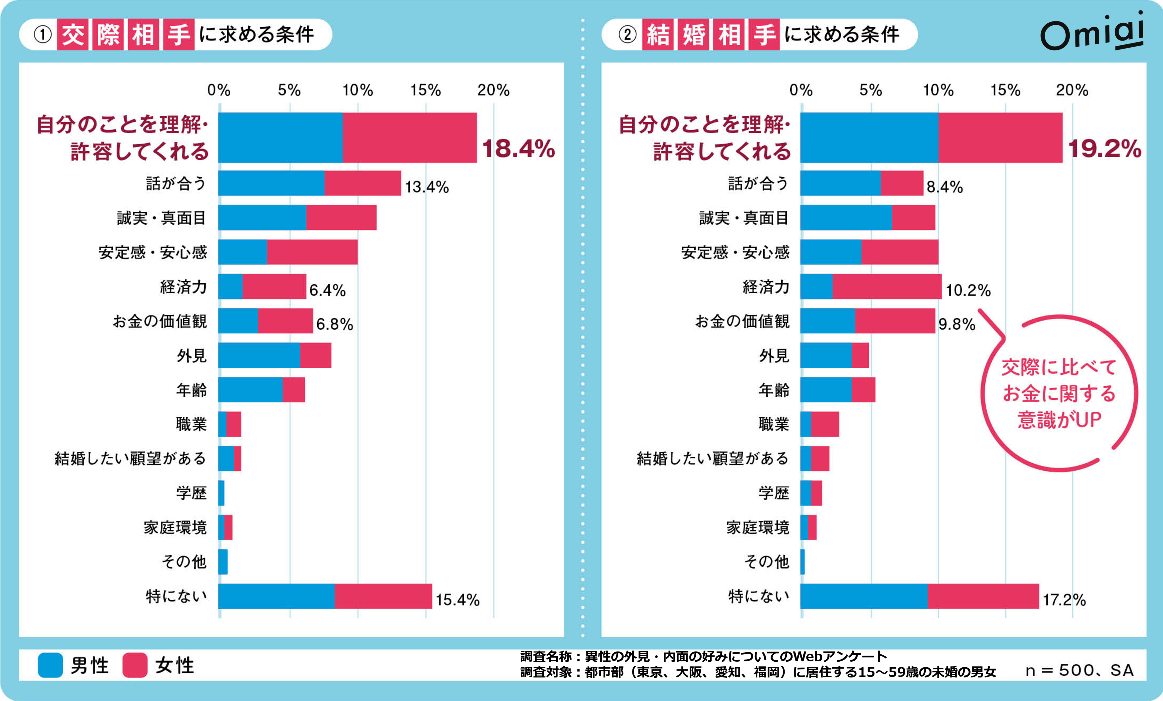 今回の調査結果、「話が合う」の項目では、交際は13.4%だったのに対し、結婚になると8.4%に減少。一方で、「経済力」は交際が6.4%だったのに対し結婚では10.2%、「お金の価値観」は交際が6.8%に対し、結婚は9.8%と上昇しています。交際するなら話が合って一緒に居て楽しい相手を、結婚するならお金の価値観が合って経済力のある相手を選ぶのは、当然と言えば当然の結果です。ただし、そうした条件だけで選んでしまうと、実は相性が合うかもしれない人が候補から外れてしまうかもしれません。そうした点では、交際で15.4%、結婚で17.2%だった「特にない」と回答した人は、実は無条件で相性の合う相手を見つけ出せる恋愛強者なのかもしれません。