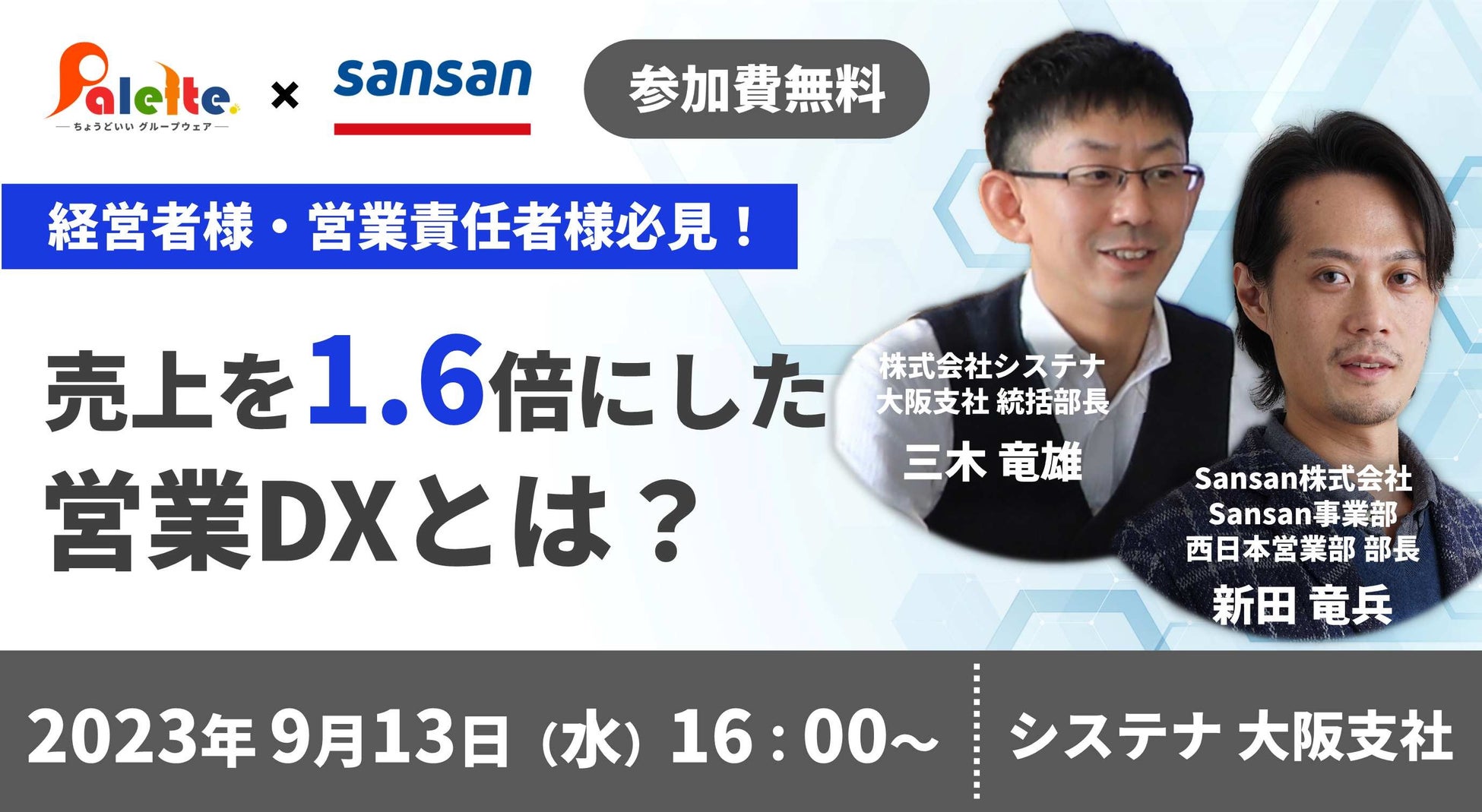 【9/13(水)16:00】経営者様・営業責任者様必見!売上を1.6倍にした営業DXとは?Sansan株式会社との共催セミナー開催!