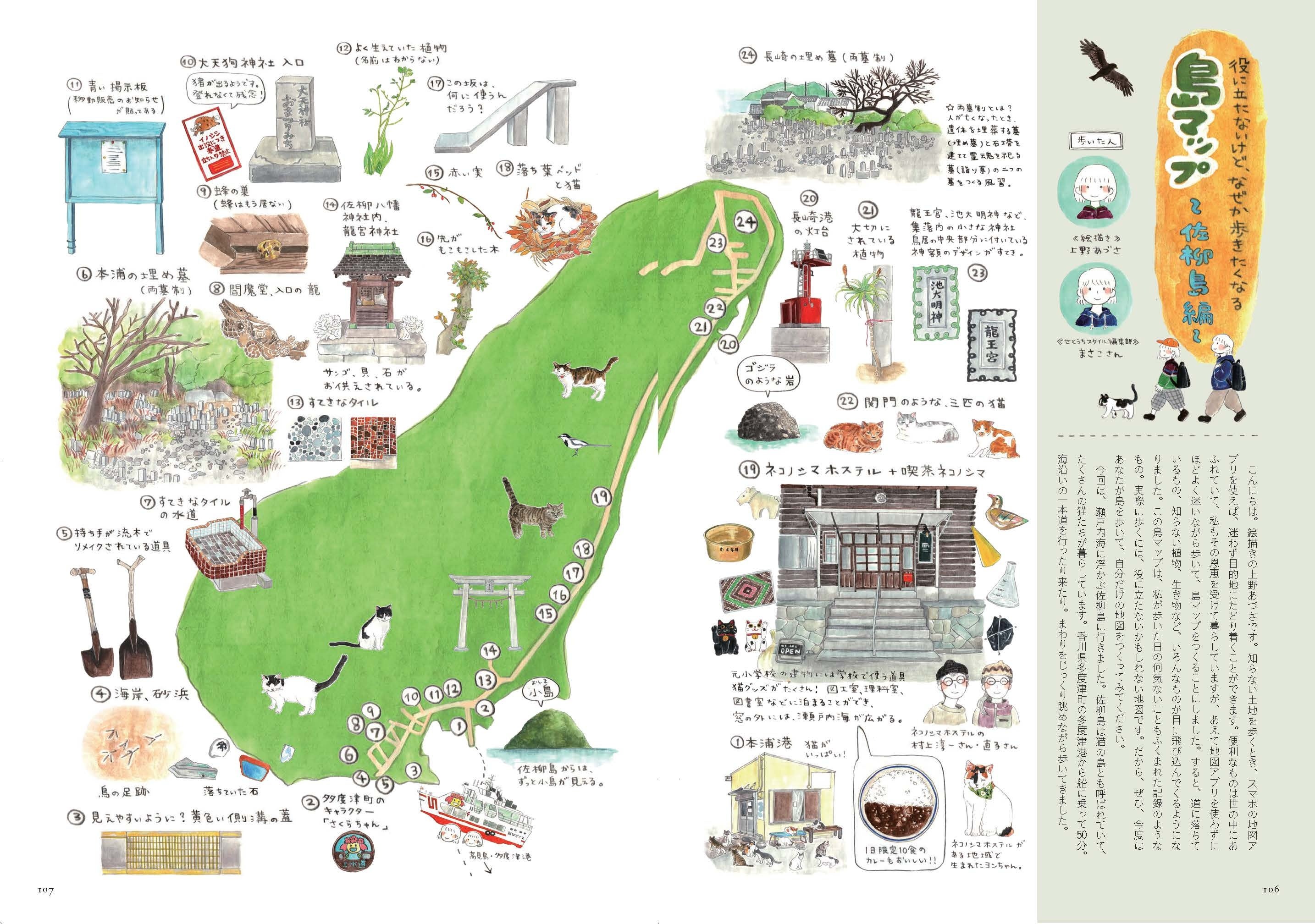 瀬戸内在住のイラストレーターが島を歩いて島のマップをつくる企画。今回は猫の島として知られる香川県の佐柳島。