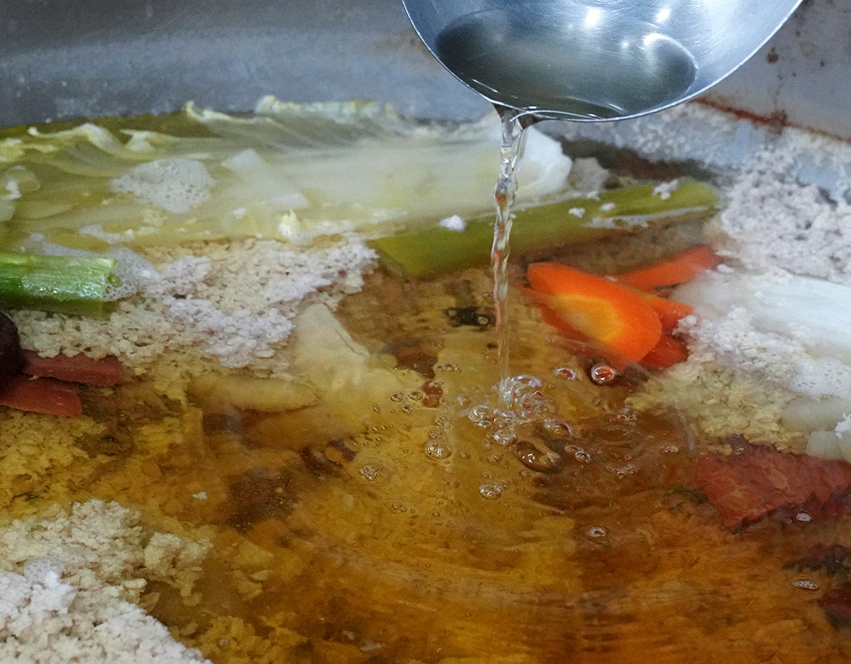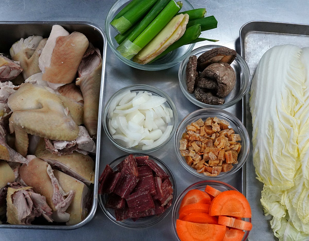 赤坂四川飯店では、豚赤身肉と鶏むね肉をベースに親鶏・金華ハム・干し貝柱・ねぎ・しょうが・玉ねぎ、にんじん、白菜などを煮込んで清湯を作ります。