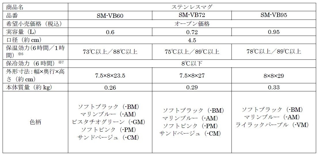 ※7 保冷効力とは、室温20℃±2℃において、製品に冷水を取扱説明書に記載の位置まで満たし、縦置きにした状態で水の温度が4℃±1℃のときから6時間放置した場合におけるその水の温度