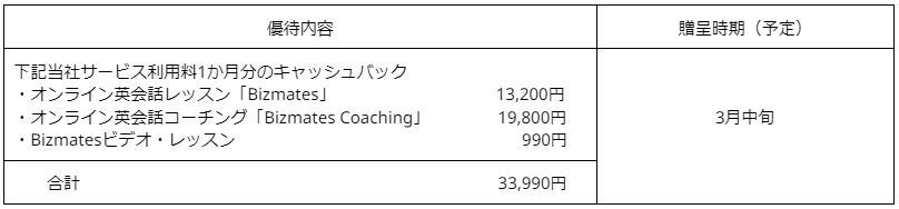 ・「Bizmates」のキャッシュバック金額は13,200円を上限といたします。毎日2レッスンプラン等、上限金額を超える部分に対してはキャッシュバックの対象外となります。