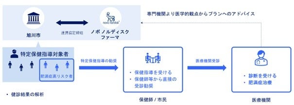 本協定は、ノボ ノルディスク ファーマおよび旭川市が連携・協力を行うことを通じて、旭川市における肥満症対策の構築および市民の健康寿命延伸を図ること、ならびに旭川市で肥満症を取り巻く環境の先進モデルを構築し、好事例を全国へ広げることを目的としています。具体的には、旭川市国保特定健診受診者のうち、肥満症のリスクが高い対象者に対し、保健指導などを通じて医療機関への受診を促すとともに、市民に対する肥満症の疾患啓発を行うことで、疾患に対する正しい知識の普及に取り組みます。