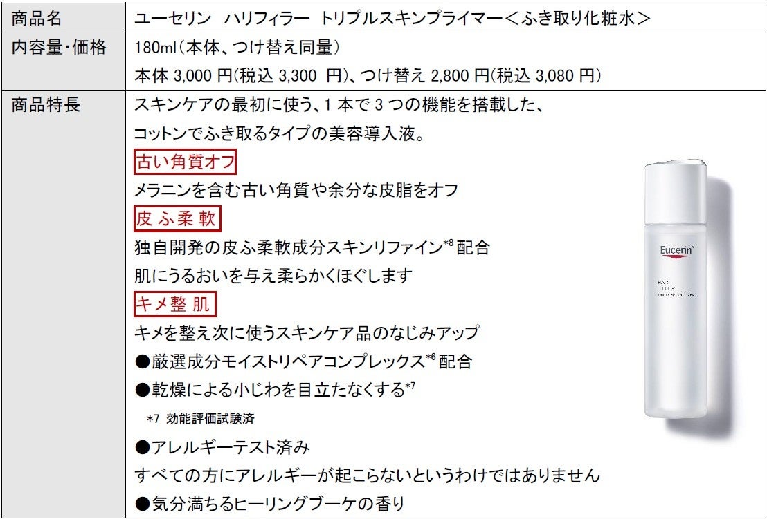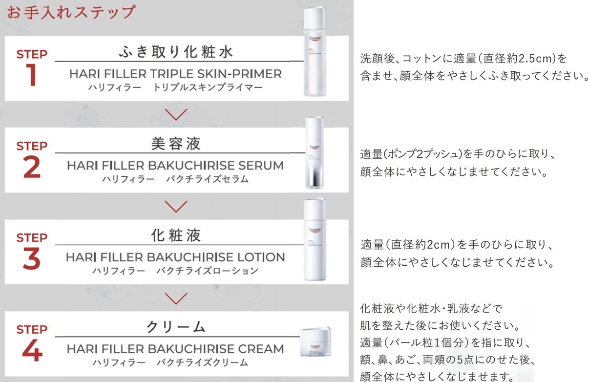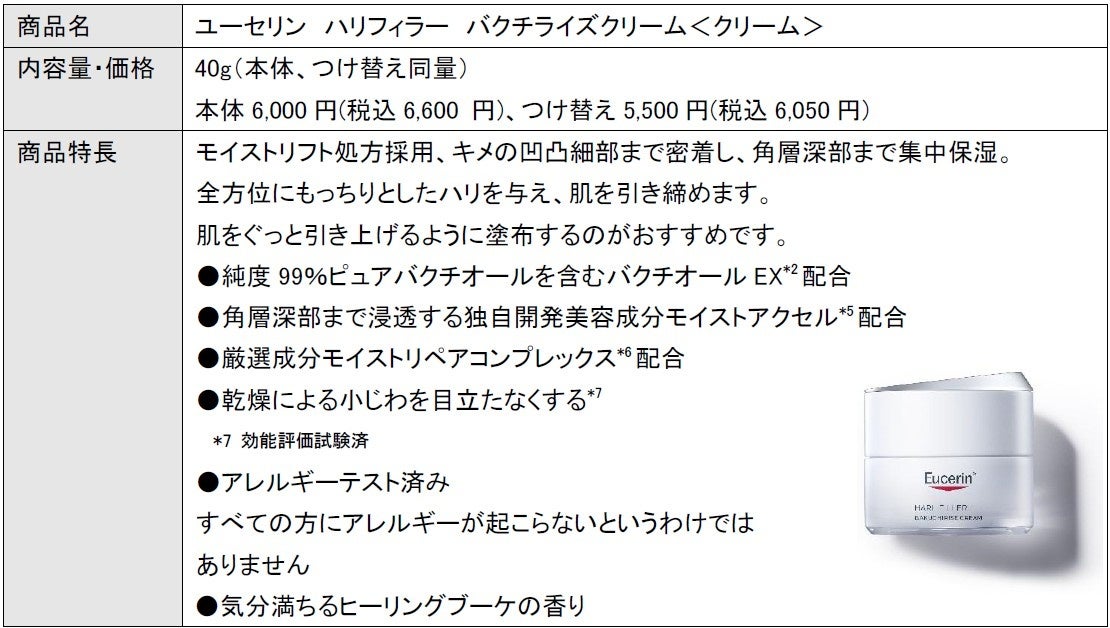 そこで、「Eucerin」ブランドより「ハリ深度」*3に着目した「HARI FILLER(ハリフィラー)」シリーズを発売いたします。キー成分として、純度99%ピュアバクチオールを含むバクチオールEX*2を配合(トリプルスキンプライマーを除く)。湧き上がるようなハリを肌に与え、お手入れの手ごたえを感じていただけます。