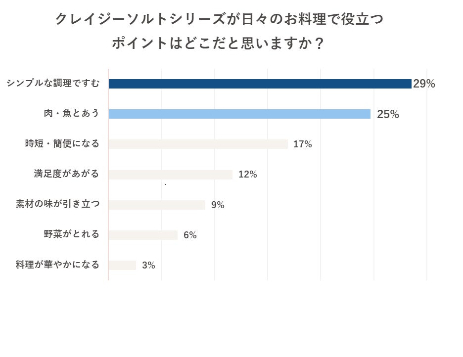 モニターを対象にしたアンケート結果からも、「クレイジーソルト」「クレイジーガーリック」が役立つポイントとして、「シンプルな調理ですむ」「肉と魚とあう」といった点で評価が集まりました。投稿や投稿上でのコメントだけでなく、定量データからも「カロパ料理」にとって「クレイジーソルト」「クレイジーガーリック」がありがたい存在であることが生活者の声から判明しました。