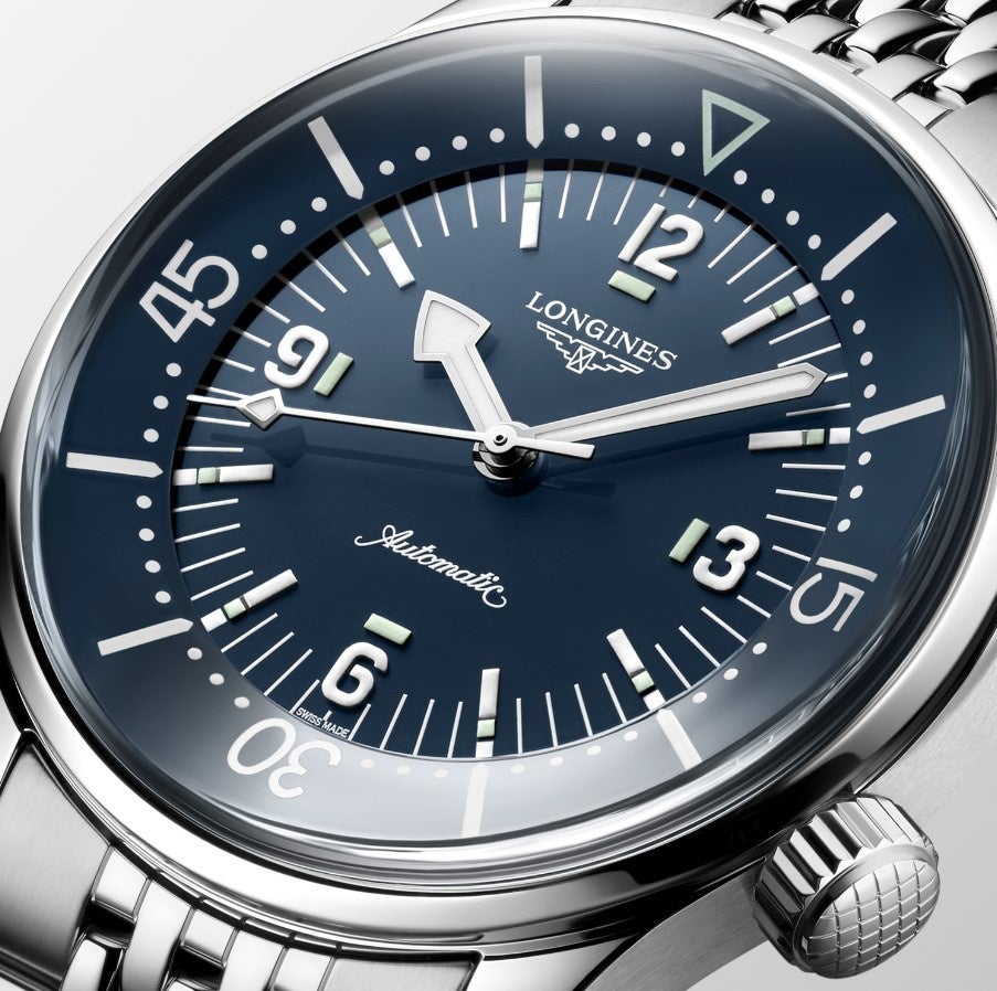 新作「ロンジン レジェンドダイバー」は、クラシックな印象の小径39mmのケースを採用し、1959年のオリジナルモデルのアイコニックなデザインをより忠実に踏襲。オリジナルと同様に日付表示のない文字盤が象徴的な意匠を一層引き立て、深海を思わせる絶妙なブルーのラッカー仕上げと、オーセンティックなブラックのラッカー仕上げの2色を展開します。オリジナルを彷彿させるロジウムカラーとポリッシュ仕上げを施したアローシェイプの針、時刻を表示する細長いインデックスにはスーパールミノバ®を、3・6・9・12のアラビア数字とそれを強調する長方形には夜光塗料を施し、昼夜、状況を問わず最高の視認性を実現。異なる塗料のコントラストは、夜間でのデザイン性も高めます。クラシックなドーム型サファイアクリスタルの両面には多層反射防止加工を施し、より見やすい文字盤に。象徴的なデザインであり、潜水時間を計測するインナー双方向回転ベゼルは、2時位置のねじ込み式リューズで操作し、ケース内に配置することで取り扱いや偶発的な衝撃による誤作動を防ぎます。ベゼルには60分単位の目盛りと、12時位置に視認性を高める夜光塗料を塗布したトライアングルマーカーを配置し、内側への絶妙な傾斜による立体感が全体の印象を引き締めます。