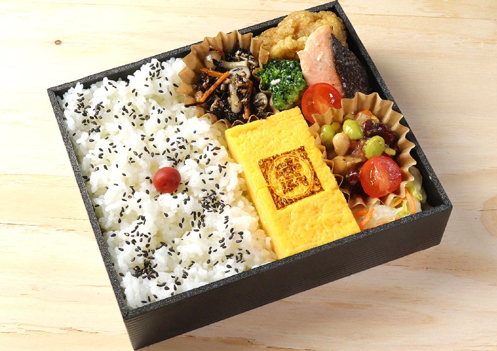 高級感のある黒箱に、焼印を押した大きな玉子焼きを詰めました。丁寧に付け込まれた鮭と一緒に、玉子焼きが主役になるお弁当を、ご堪能ください。