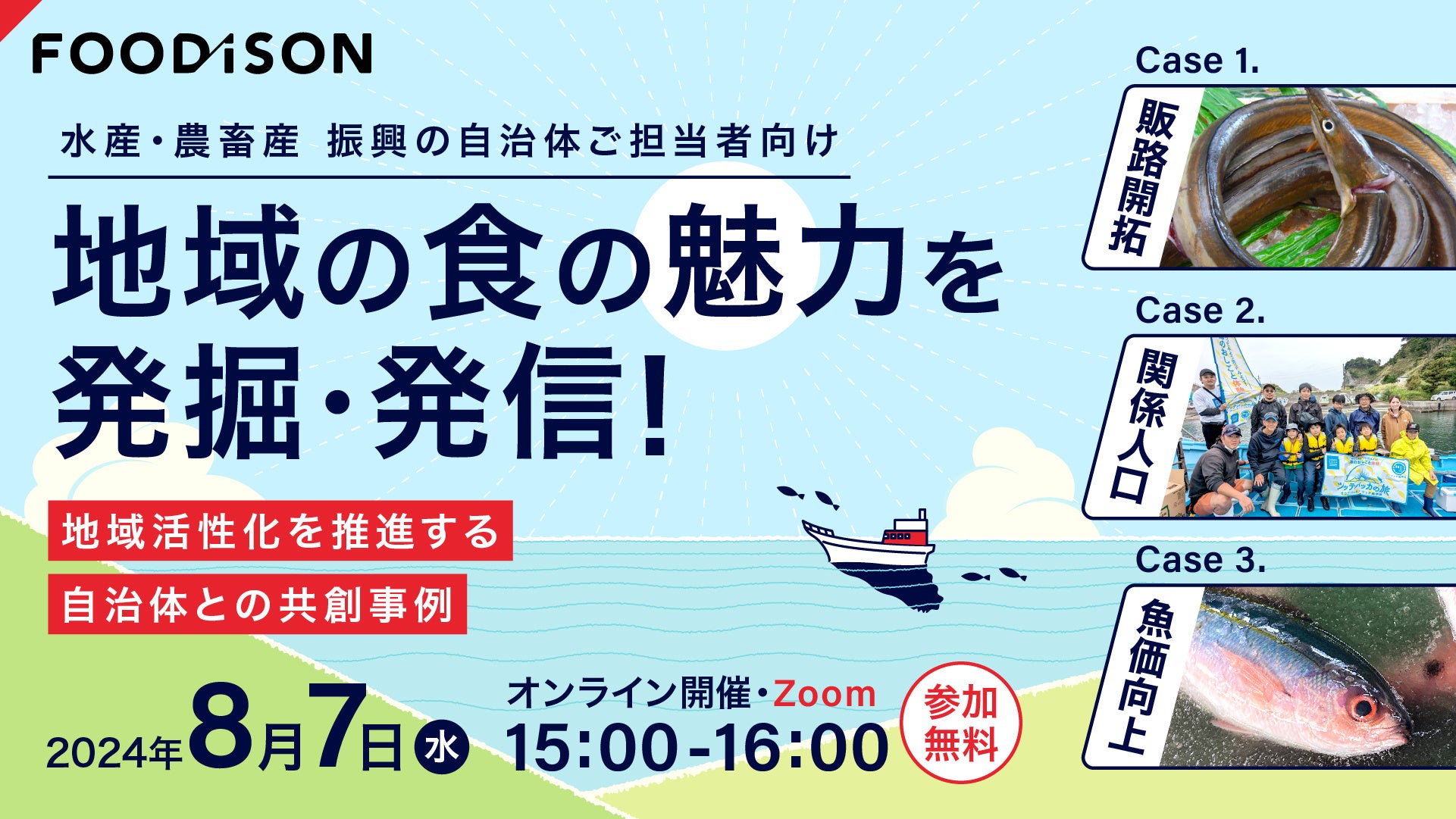 「生鮮流通に新しい循環を」をビジョンに掲げる株式会社フーディソン(本社:東京都中央区、代表取締役CEO山本徹、証券コード:7114、以下当社)は、2024年8月7日(水)、水産・農畜産の振興に携わる自治体・企業の担当者を対象に「地域の食の魅力を発掘・発信!〜地域活性化を推進する自治体との共創事例〜」ウェビナーを開催します。