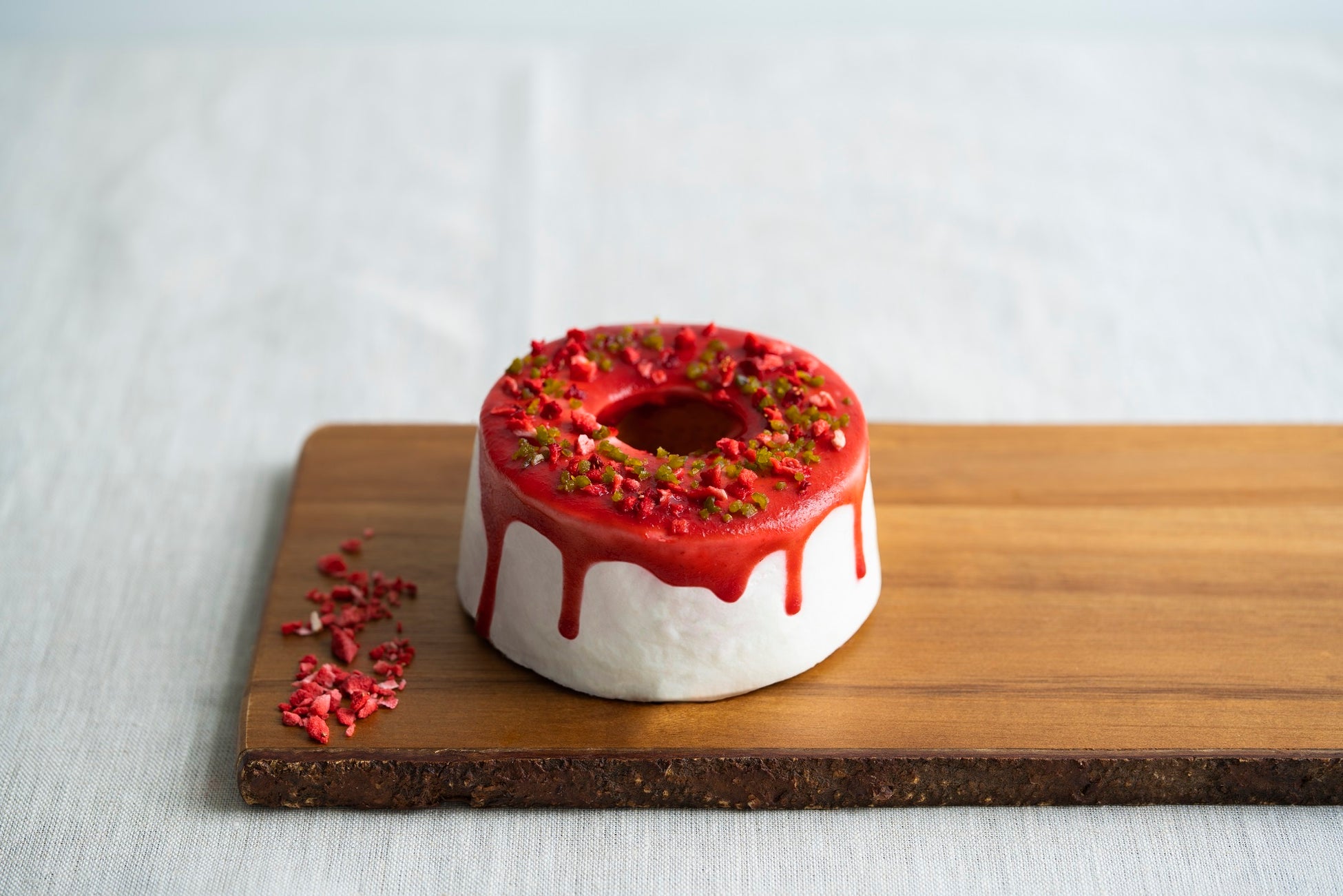シフォンケーキの生地には米油を使用し、しっとりふわふわの軽い口当たりに仕上げました。生クリームのコーティングと、それぞれのソースのバランスが良く、口どけも滑らかで、ついつい手が伸びるケーキ。見た目の可愛らしさやシズル感など、ビジュアル的にも優れています。