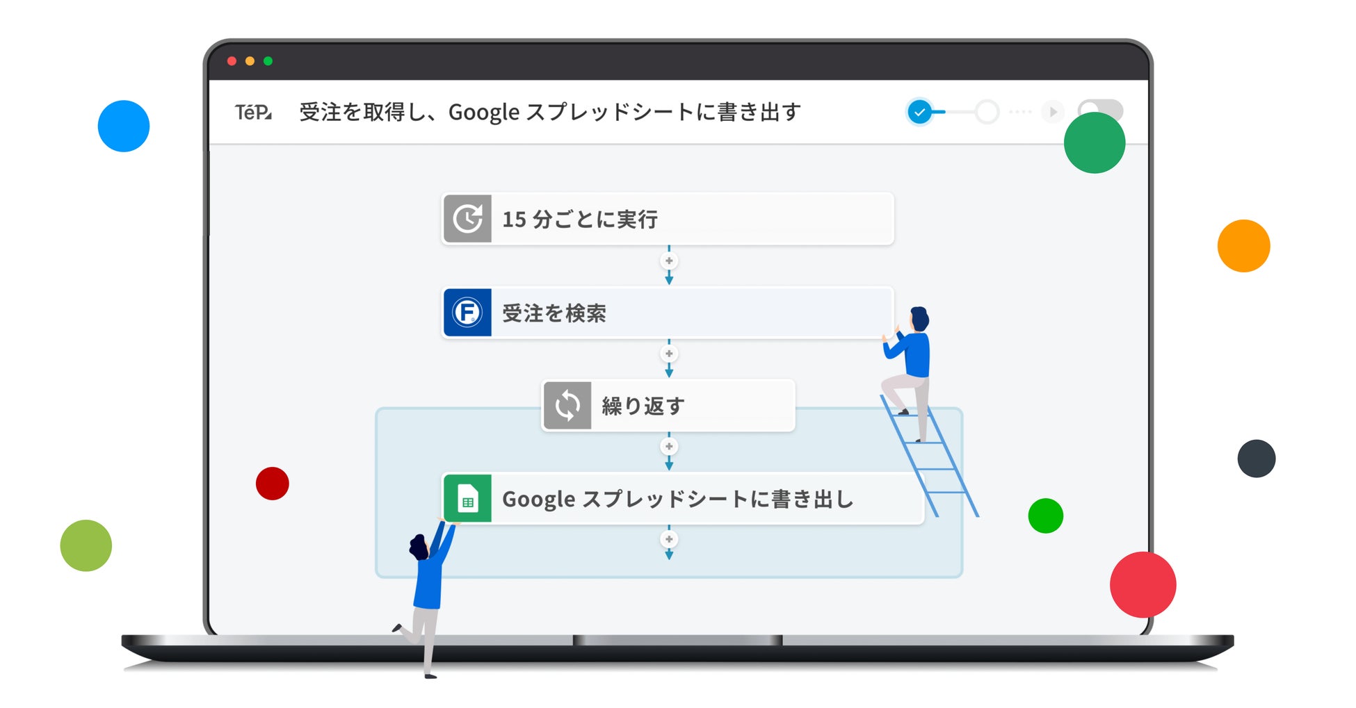「TēPs(テープス)」 は、ECサイト運営業務のワークフローを自動化するツールを、担当者が自分自身で作成できる、ノーコードクラウドサービスです。