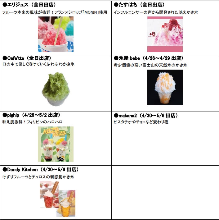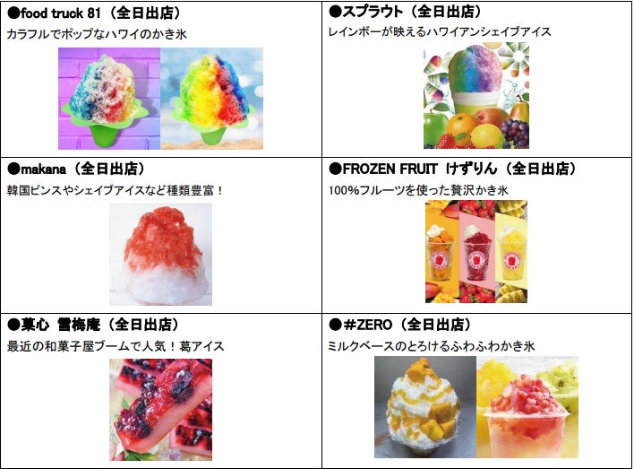 イベント期間中は、ハワイで人気のかき氷『ハワイアンシェイブアイス』や韓国で定番のスイーツ『韓国ピンス』、フィリピンの代表的なスイーツの『ハロハロ』など世界中の様々なかき氷や、抹茶やほうじ茶などを使用した和のかき氷など、カラフルでSNS映えするかき氷メニューを提供するキッチンカーが1日最大12台出店します。また、三井ショッピングパークポイントLINE公式アカウント登録およびダイバーシティ東京 プラザを新規で施設登録していただくと、「ODAIBAかき氷フェス」のキッチンカーで使用できる100円引きクーポンをプレゼントします。今年のGWは、ダイバーシティ東京 プラザでひと足先に夏気分をお楽しみください。