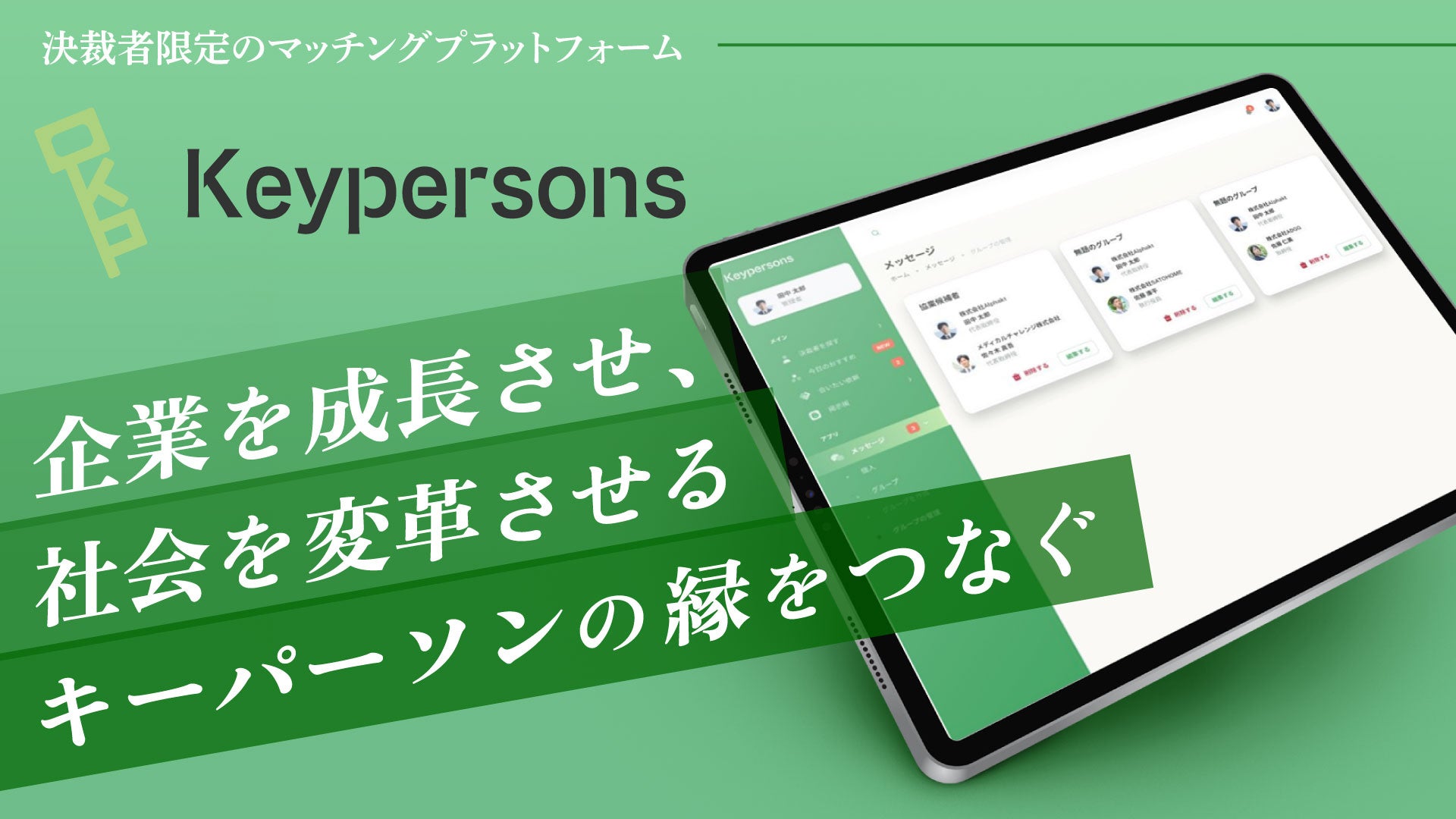 「Keypersons」は日本全国の企業のキーパーソン(決裁者:代表取締役、取締役、執行役員、事業部長)が登録できる、決裁者限定マッチングプラットフォームです。幅広い業種・規模・地域の企業の決裁者同士が直接コンタクトを取ることで、営業活動のスピードアップはもちろん、事業提携・資本提携先の開拓、人脈形成にも重要な役割を果たします。