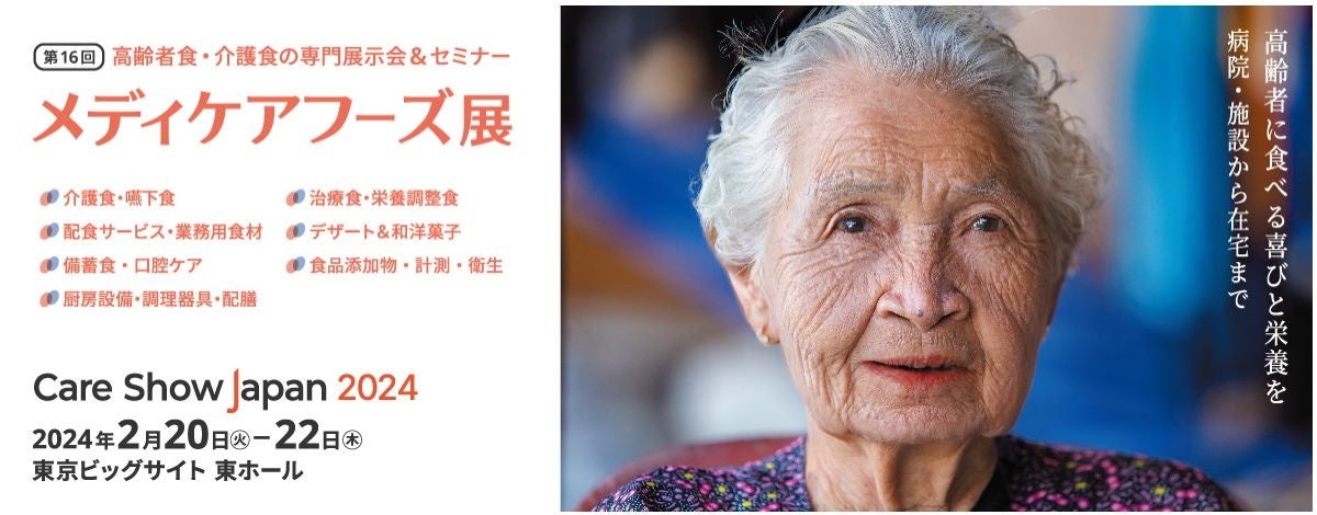 インフォーマ マーケッツ ジャパン株式会社(東京都千代⽥区・代表取締役 クリストファー・イブ)は、2024年2 ⽉20 ⽇〜22 ⽇に東京ビッグサイト東4 ホールにて、⾼齢者⾷・介護⾷の展⽰会「メディケアフーズ展(Care Show Japan 2024 内)」を開催します。