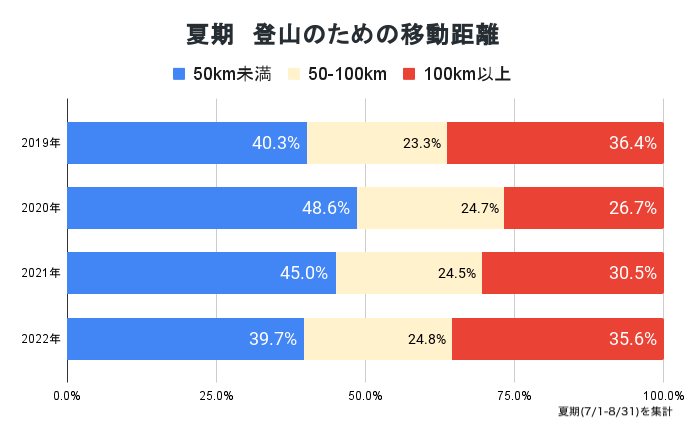 外出が最も制限された2020年の夏、登山者は近場の低山へ行く傾向(特に自宅から50km圏内の山が急増)が見られました。今年(2022年)の夏は、登山をするために移動した距離は、50km未満が約40%、50-100kmが約25%、100km以上が約35%と、コロナ前の2019年と同じ水準に戻っています。2022年は3年ぶりに行動制限のない夏であったためと考えられます。