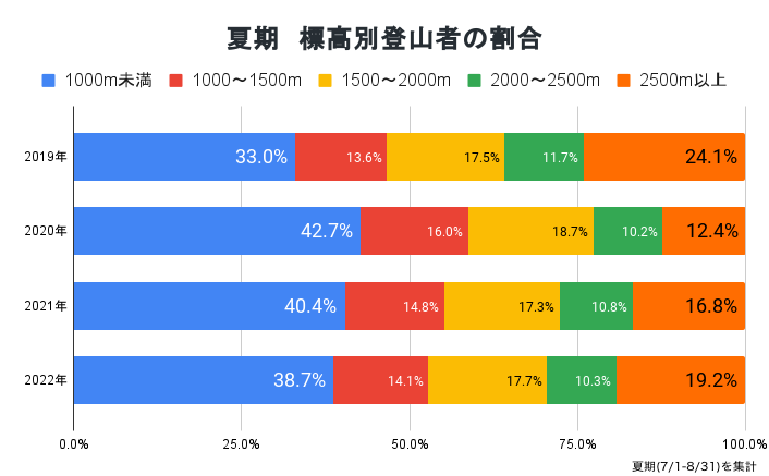 2022年の夏に登った山の標高を見ると、「1000m未満の低山」38.7%、「2500m以上の高山」19.2%となっています。高山に行く登山者の割合は、コロナ前の2019年の水準に戻りつつありますが、まだ完全に戻ったとは言えません。これは、withコロナ時代になり、山小屋が宿泊人数を減らして対応していたり、完全予約制になっていたりすることが影響していると思われます。