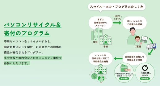 スマイル・エコ・プログラムは、ご家庭に眠る不用なパソコンのリサイクルを通じた“都市鉱山”リサイクルと教育支援・寄付のプログラムです。