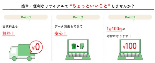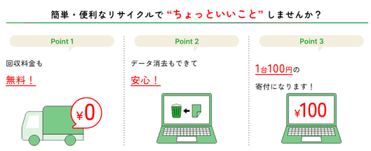 このプログラムは、“パソコンリサイクルでちょっと良いことしませんか?” を合言葉に、パソコンのリサイクル回収1台につき100円が学校等に寄付される仕組みで、各学校では備品の購入費用等に充てられるため、保護者・地域の方はパソコンリサイクルを通じて学校を応援する事に繋がります。