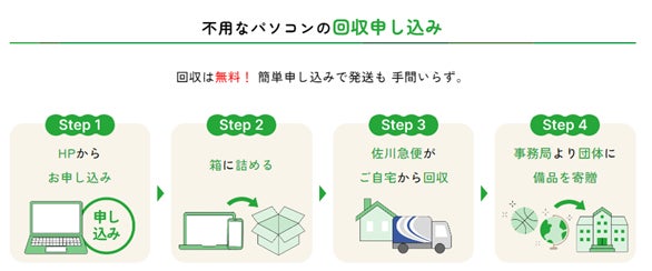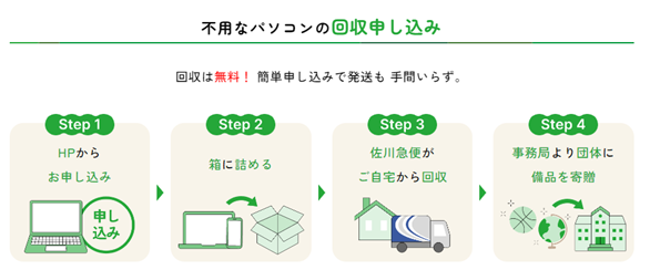 回収料金は「無料」で、希望日時(年中無休・最短翌日)に佐川急便がご自宅から回収し、国の認定工場で確実に処理を行います。