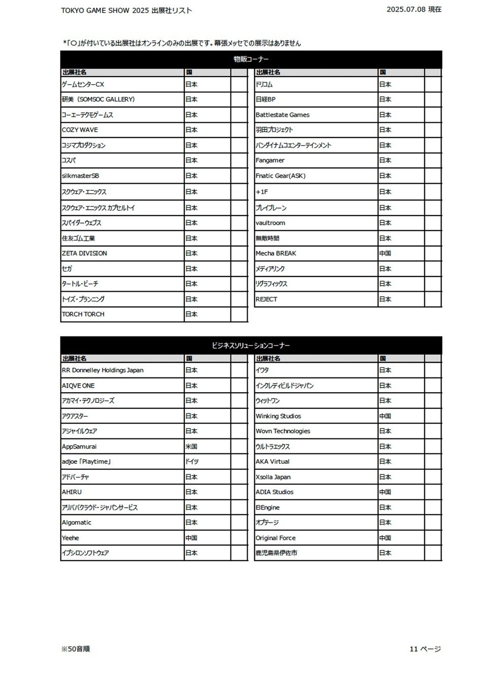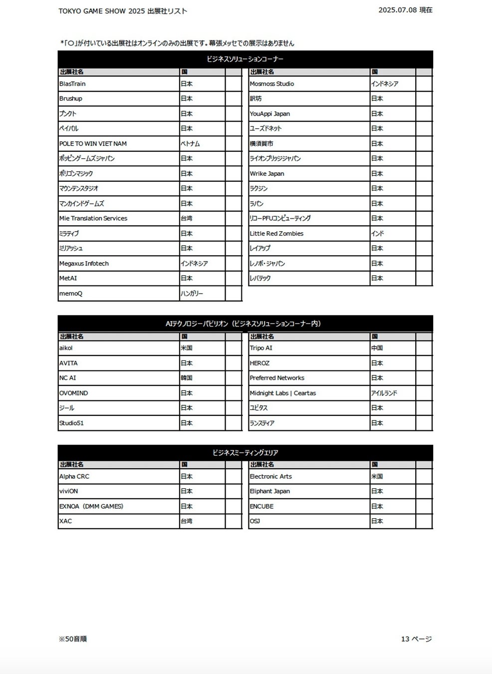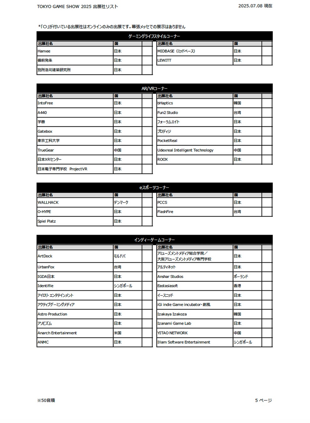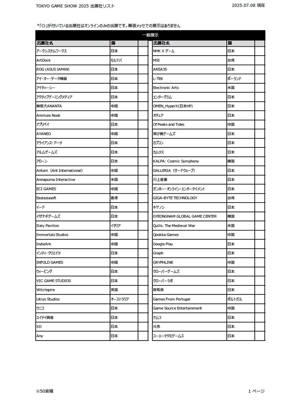 一般社団法人コンピュータエンターテインメント協会(略称:CESA、会⻑:辻本 春弘)は、東京ゲームショウ2025(以下、TGS2025)の出展社一覧を本日公開したことをお知らせいたします。