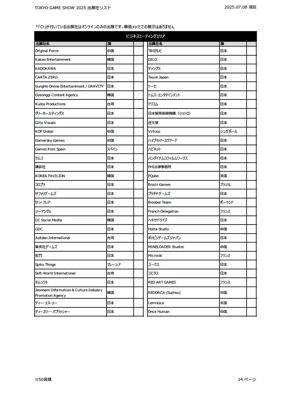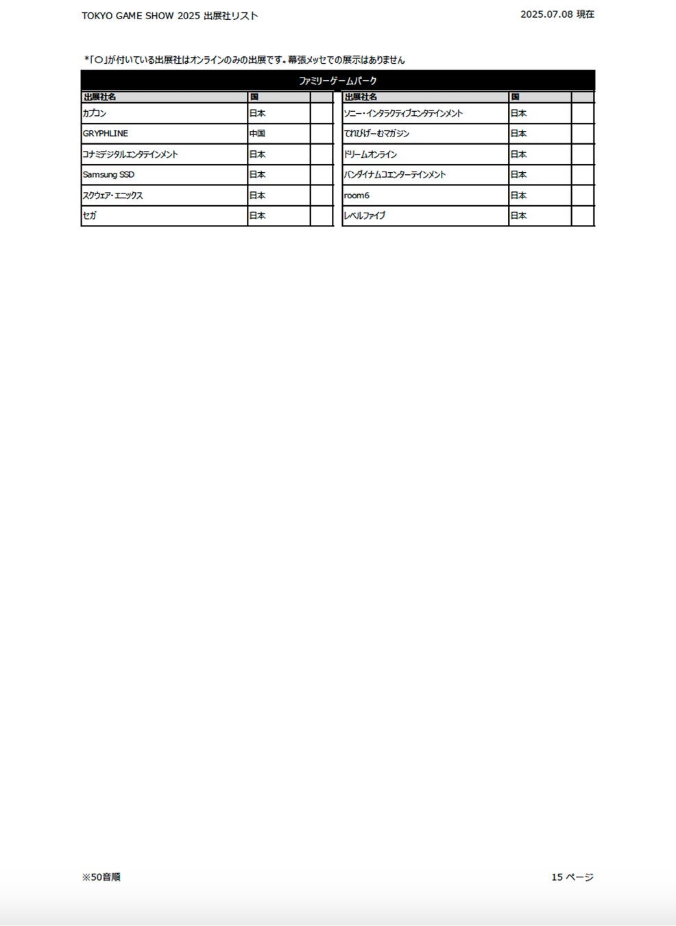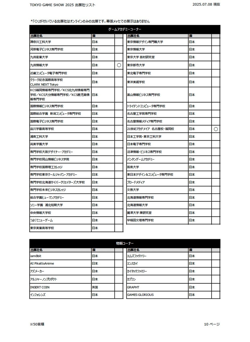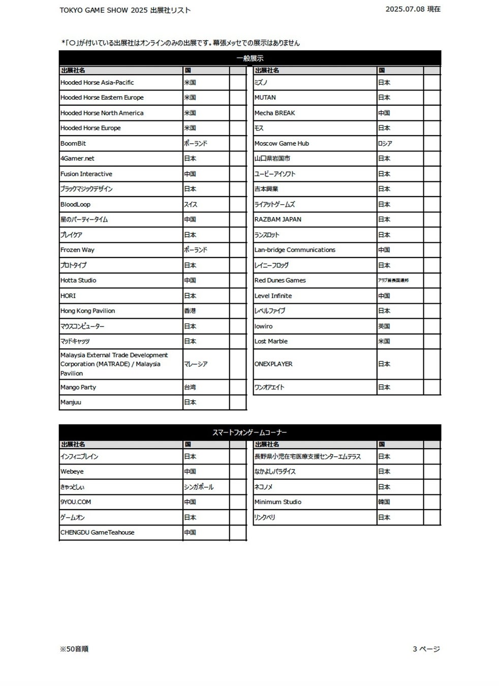 一般社団法人コンピュータエンターテインメント協会(略称:CESA、会⻑:辻本 春弘)は、東京ゲームショウ2025(以下、TGS2025)の出展社一覧を本日公開したことをお知らせいたします。