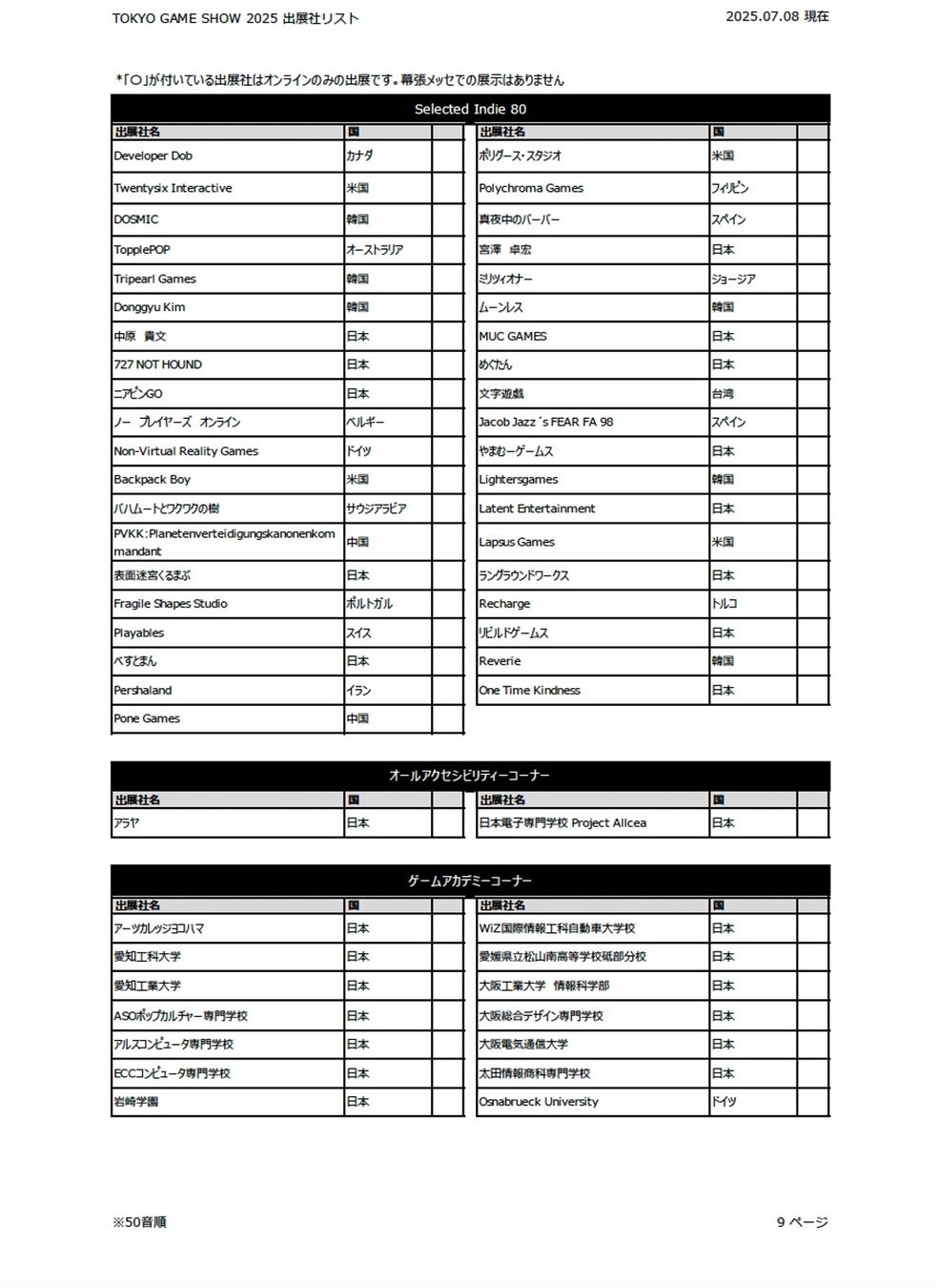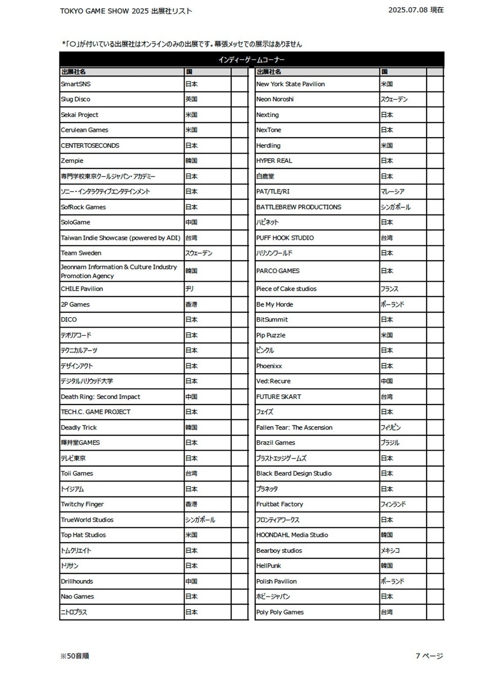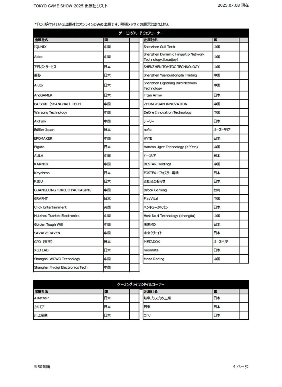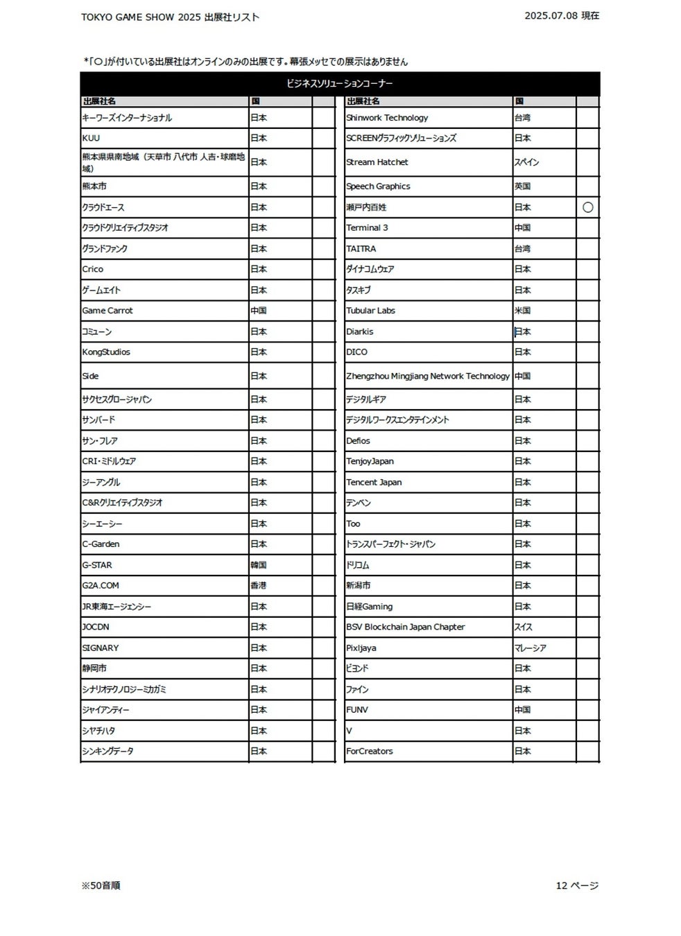 一般社団法人コンピュータエンターテインメント協会(略称:CESA、会⻑:辻本 春弘)は、東京ゲームショウ2025(以下、TGS2025)の出展社一覧を本日公開したことをお知らせいたします。