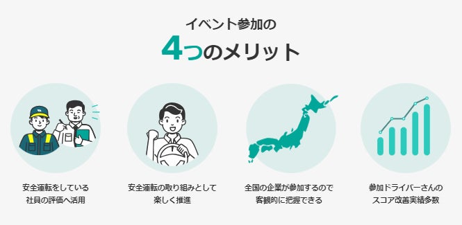 全国安全運転イベントは、楽しみながら安全運転を推進することを目的として、2019年からスタートしました。「SmartDrive Fleet」をご利用の企業を対象とし、車載デバイスを通して収集されるデータを活用して、全国各地の幅広い業種業態の企業・ドライバーの運転が同じ基準で診断されることが大きな特徴です。自社内だけではなく、全国の様々な企業と一緒になって安全運転への意識を高めることができると評価いただいています。
