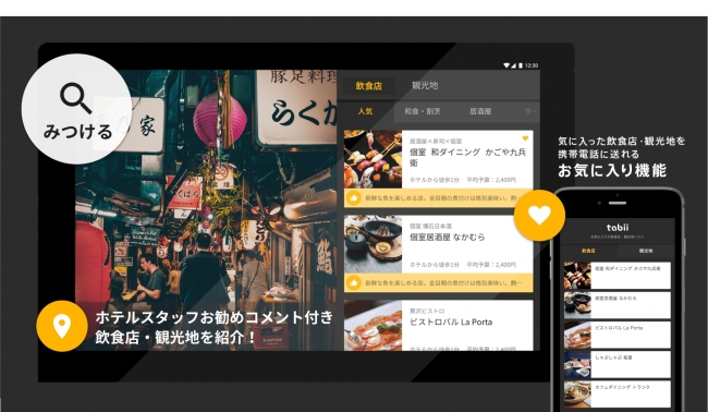「tabii」は、月額無料で利用できる客室設置型タブレットサービスです。ホテルや旅館内の案内やその土地ならではのグルメ・観光情報、音楽・エンタメ動画コンテンツなど豊富なコンテンツを取り揃えており、宿泊者の目的や趣味に応じた楽しみ方が可能です。旅の楽しみを増幅させる情報提供や滞在期間中の気分転換などにも利用いただけるサービスで、様々な顧客層に対して「客室価値の向上」を図ることができます。また導入施設は、宿泊約款や施設案内、各種お知らせを電子化することでコストカットを図れるだけでなく、これまで電話や対面で対応していた宿泊者からの問い合わせの多くを「tabii」内のQ&Aチャットボットに置き換えることができ、施設のランニングコストを増やすことなく「業務効率化」を実現するものです。