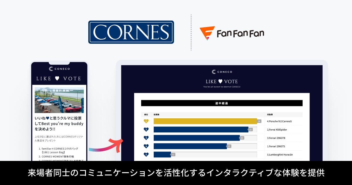 この度、コーンズ・モータース(以下コーンズ)が開催する公式オフ会「Meetup CONECO in Centrair」において、ブランドとファンの繋がりを彩る「Fan Fan Fan」を活用したリアルタイム車両投票『You’re my buddy』が実施され、お客様とのコミュニケーション促進に貢献しました。