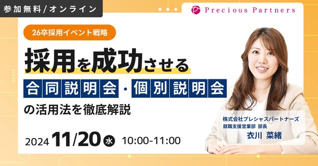 採用コンサルティング事業を行う株式会社プレシャスパートナーズ(本社:東京都新宿区、代表取締役社長 CEO:髙﨑 誠司)は、2024年11月20日(水)に『26卒採用を成功させる合同説明会、個別説明会の活用法セミナー』をオンラインにて開催いたします。