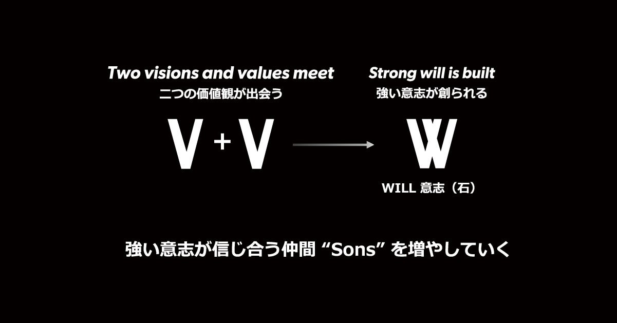 Branding Engineerは、創業以来代表2名体制による経営を継続しております。社名の「TWOSTONE」には、代表2名がそうであったように、2つの価値観(Vision・Value)が出会い合わさることで、強い意志(Will・石)が創られ「社会に新たな常識を生み出す」という意味が込められており、「V」が2つ重なった「W」の字体で表現されています。この2つの強い意志を信じ合い増えていく社員・次世代の起業家たちを「Sons」と呼び、「TWOSTONE&Sons」としました。今回の社名で表現する世界観は、2022年4月にBranding EngineerのCBO(Chief Branding Officer)に就任したケン・マスイ氏と共に構築しております。