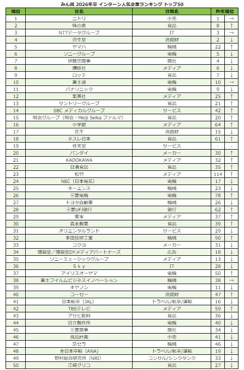 みん就、「みん就 2026年卒 インターン人気企業ランキング」を発表