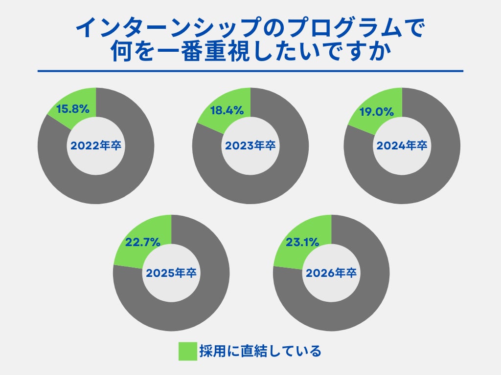また、2026年卒業予定学生を対象に行った「インターンシップのプログラムで何を一番重視したいですか?」というアンケートでは、「採用に直結している」という回答が23.1%を占めました。4 年前(2022 年卒)の15.8%から7.3ポイントも上昇しており、インターンシップを選考の一環と考える学生が増えていることがわかります。