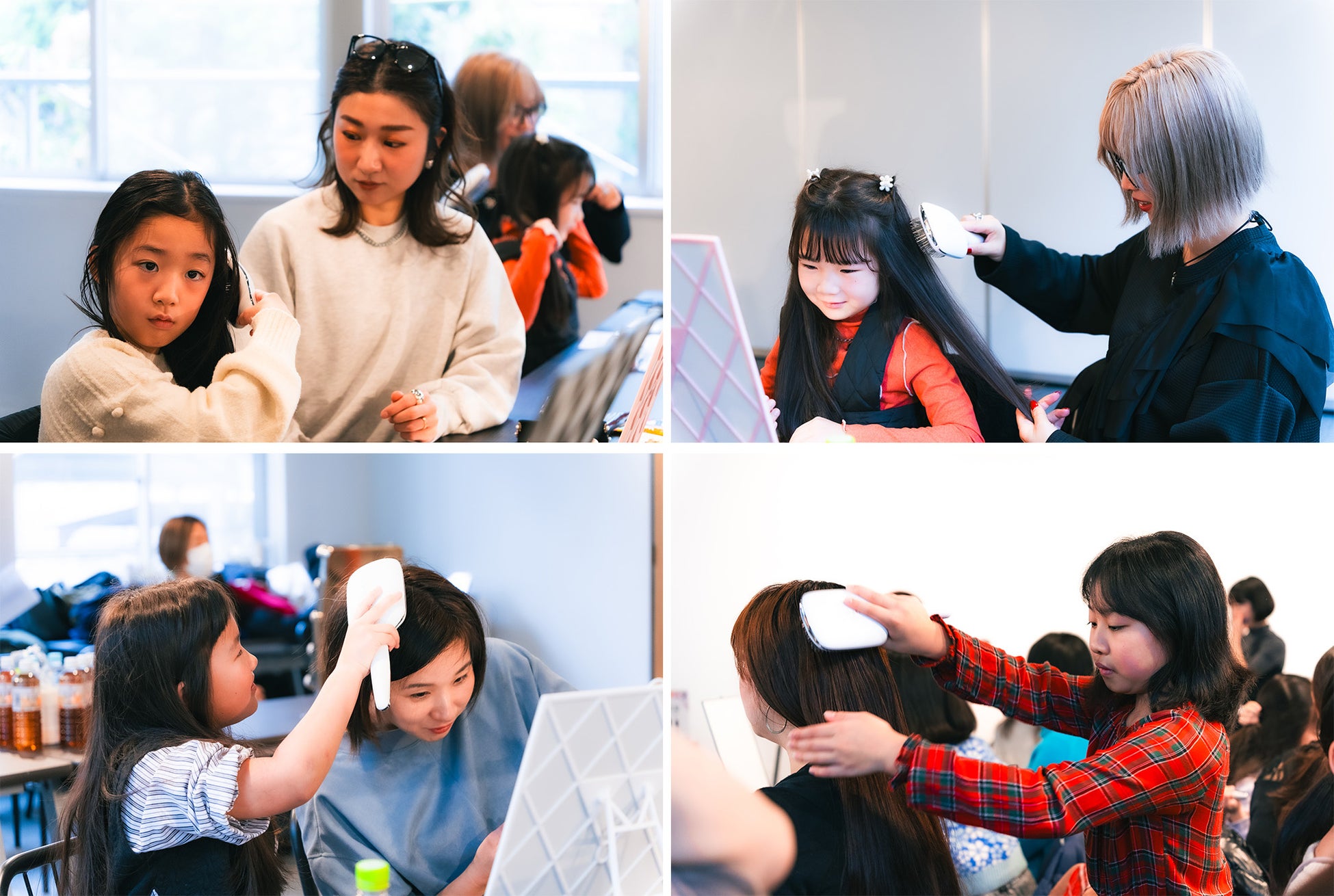 リセットブラシを親子で体験していただきました。またヘアメイクアップアーティストの横谷百栄さんにご登壇いただき、リセットブラシを使用したサラツヤ髪に導くブラッシングのポイントと、洗髪前のシャンプー・髪の毛の乾かし方を含む1日のヘアケアルーティン、簡単ヘアアレンジの方法をレクチャーしていただきました。