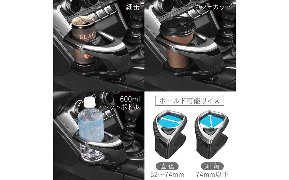 上から見た時に「直径」もしくは「対角の長さ」が52~74mmのドリンク容器に対応しています。(底から上部にかけて広がるカフェカップやチルドカップ等の場合、底から79mmの位置でのサイズが74mm以下であること。)