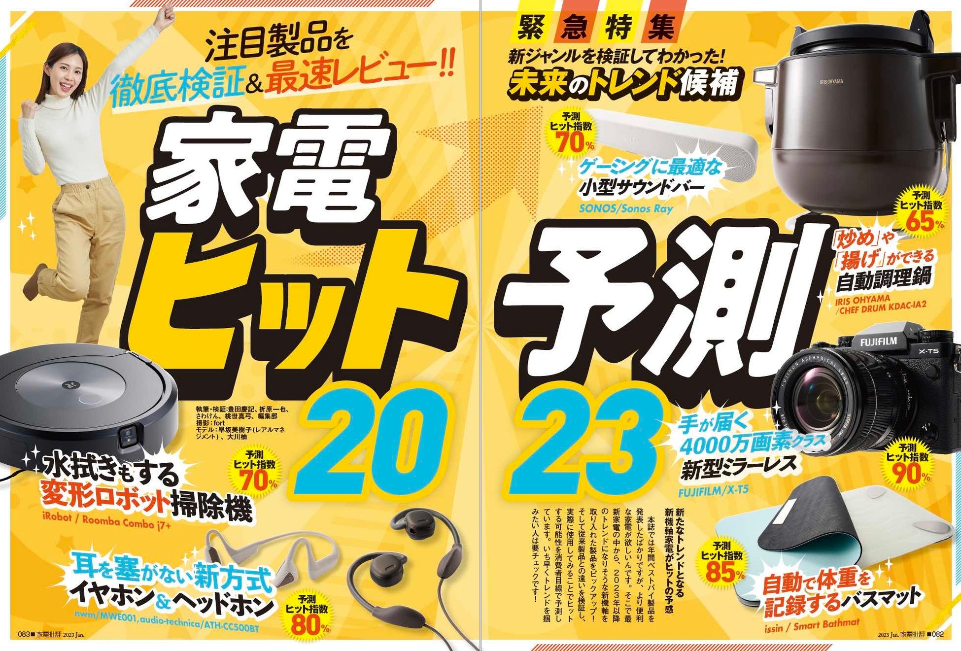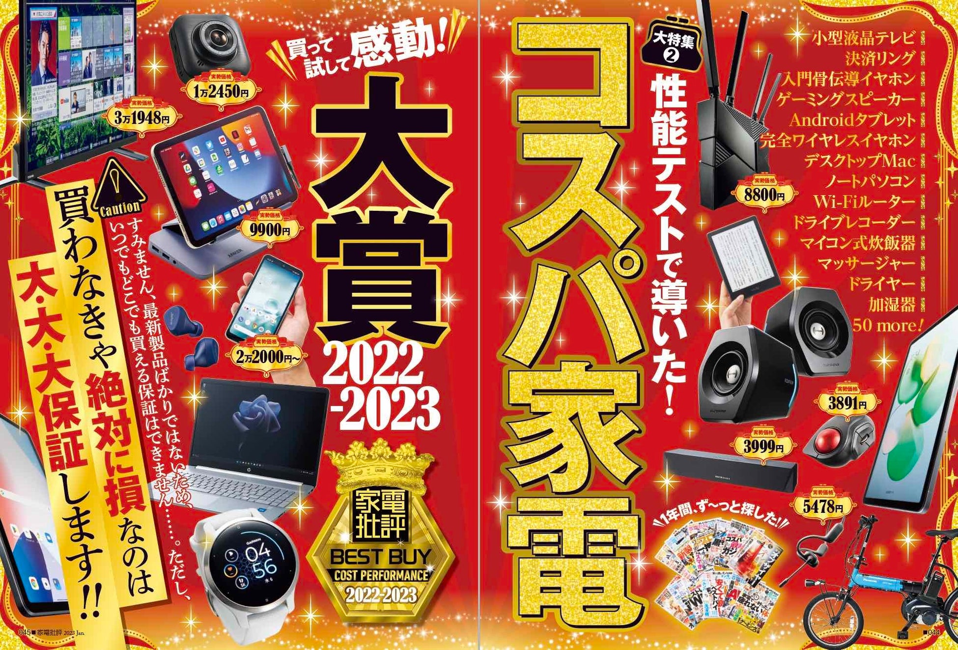 家電批評1月号は、年末のセールも初売りも得する「コスパ家電大賞」を大発表! 今年徹底検証した小型液晶テレビやスマートフォン、骨伝導イヤホンから炊飯器まで、買わなきゃ絶対損な優秀アイテム50選をご紹介。上位11製品はランキングで発表しています。さらに、最新家電の中から2023年以降のトレンドになりそうな製品をピックアップした「家電ヒット予測」、遊びや仕事にも役立つ「iPad活用術」など、暮らしを快適にする家電情報が満載。本リリースでは、商品テストに基づくベストバイ製品の一部をご紹介します。